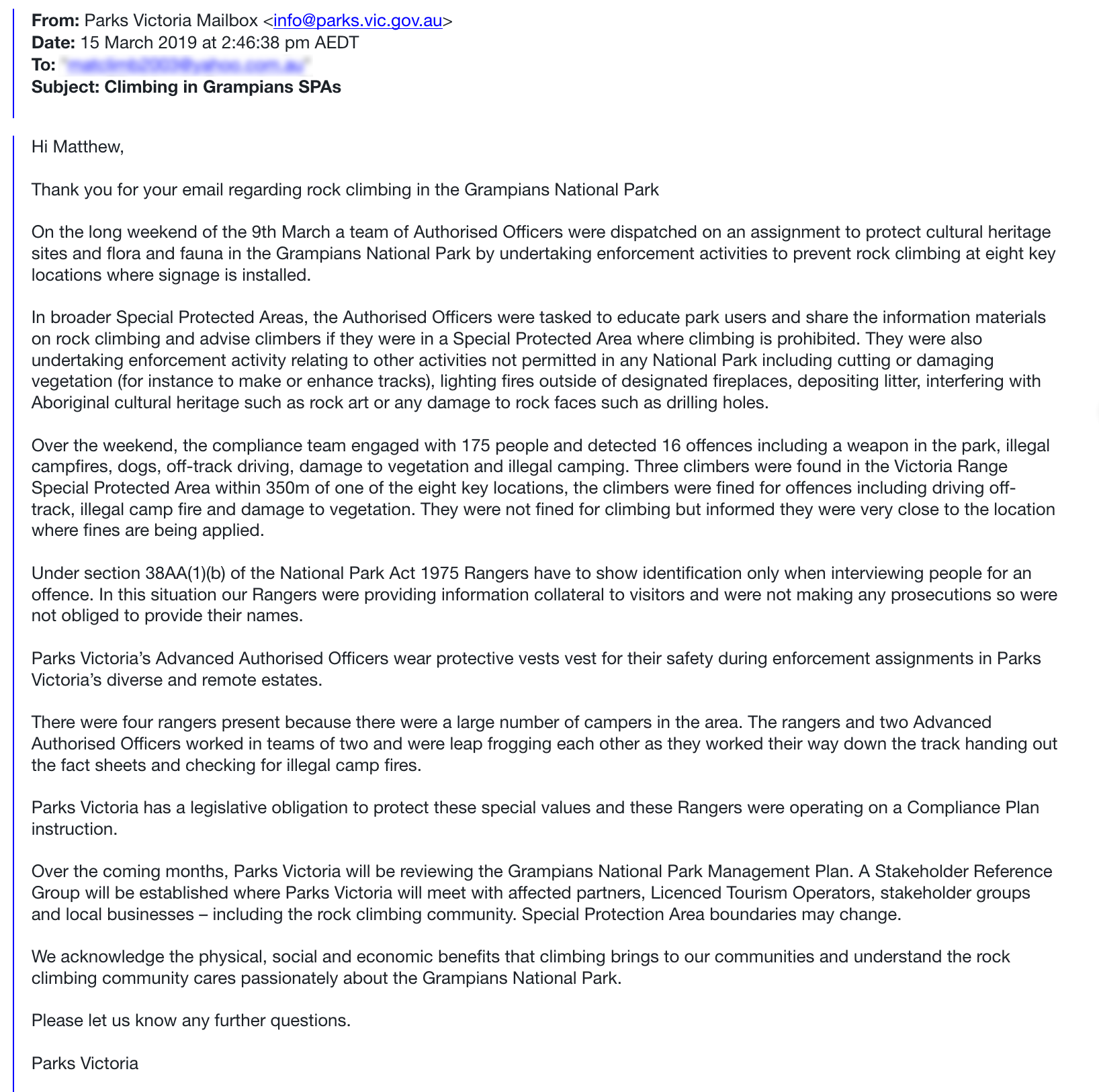 Below is the original email from Parks Victoria received by Matthew Brooks (a local climbing guide).