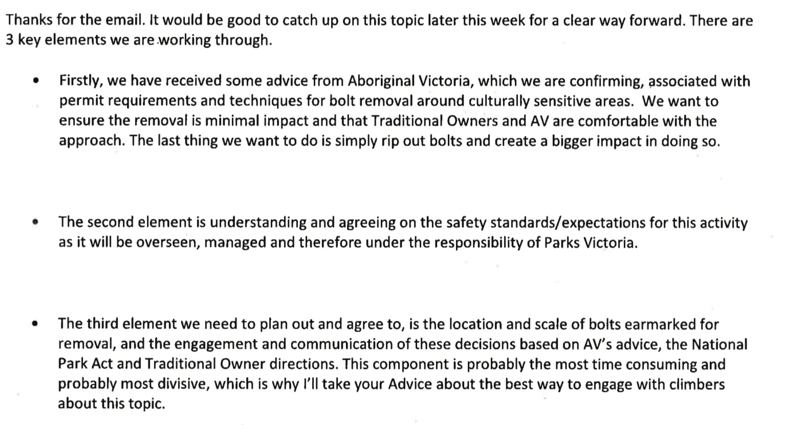 This email mentions the now infamous threat of a $1.58 million penalty for harming Aboriginal cultural heritage. Importantly it also groups “land managers” (ie PV ) into the people who this fine could apply to. This email mentions “inserting a bolt” as a potential problem. 40 minutes after that email was sent we see a reply from someone at Parks Victoria who describes it as “perfect” and they will “need to have some internal conversations in PV about the broader plan of attack”. They then list three points of action: