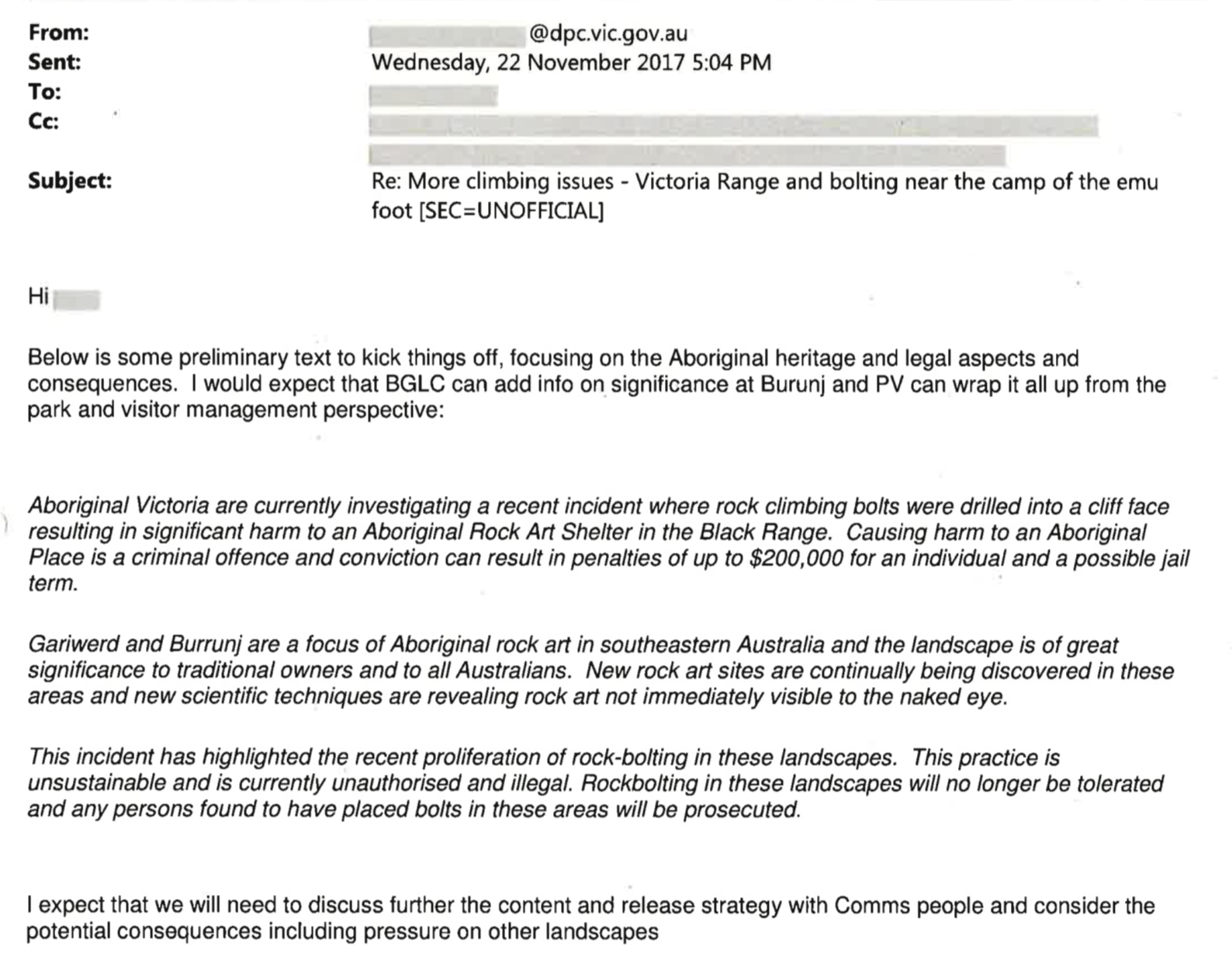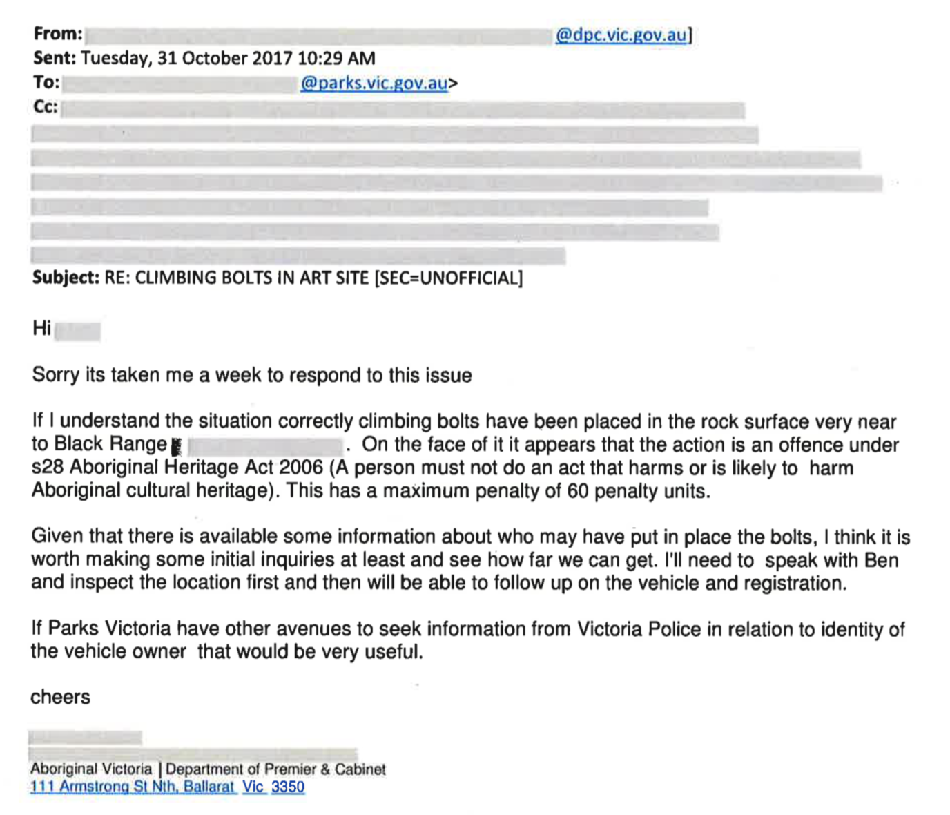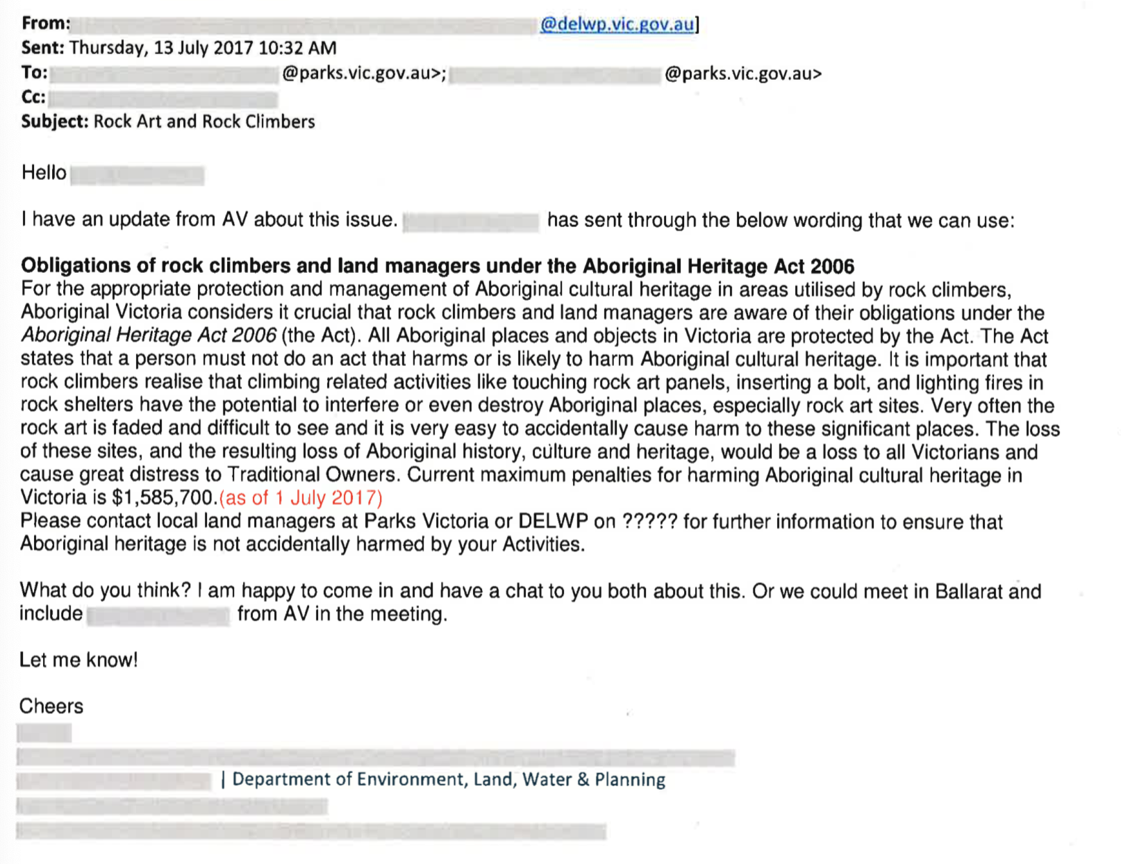 We start with an illuminating email sent in July 2017 (1.5 years before the bans were announced). In it, the unidentified author from Dept of Environment forwards a paragraph presumably drafted by someone in Aboriginal Victoria (AV) explaining the legal obligations of rock climbers and land managers under the Aboriginal Heritage Act 2006.