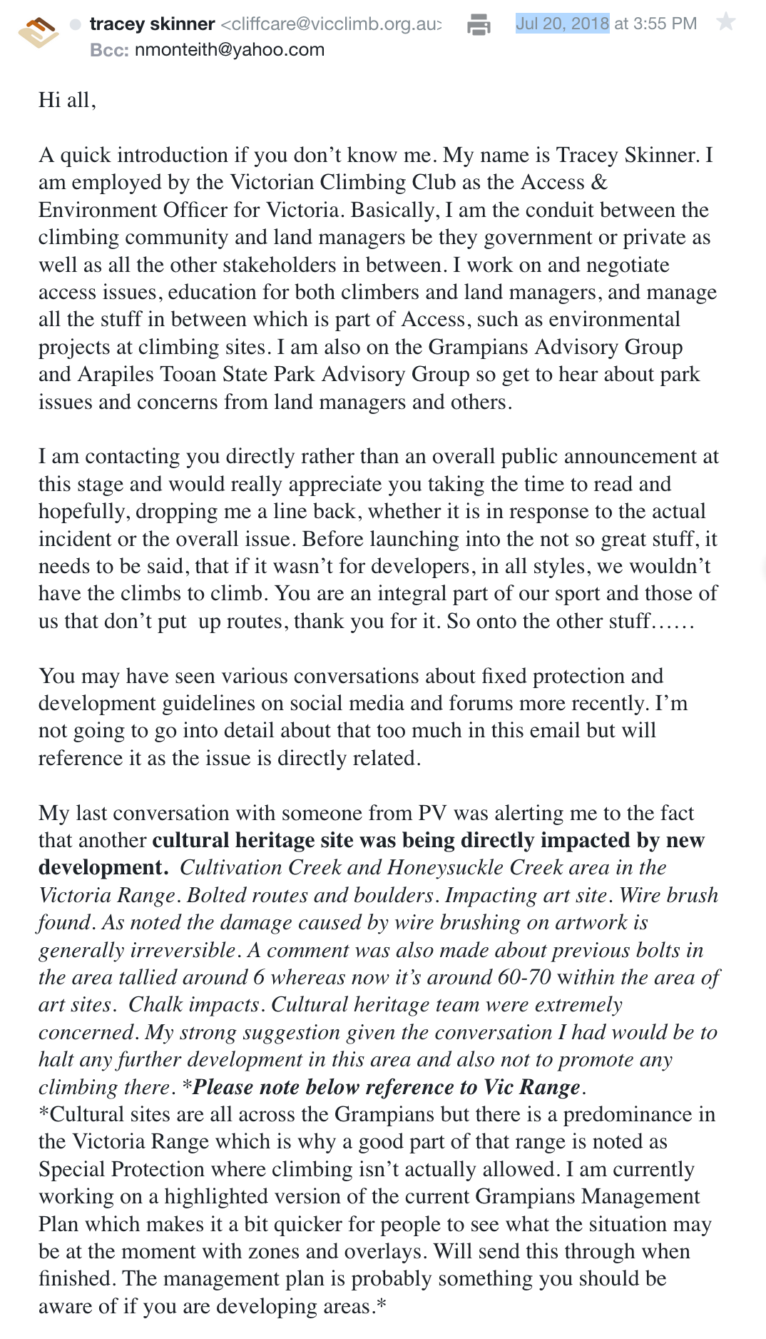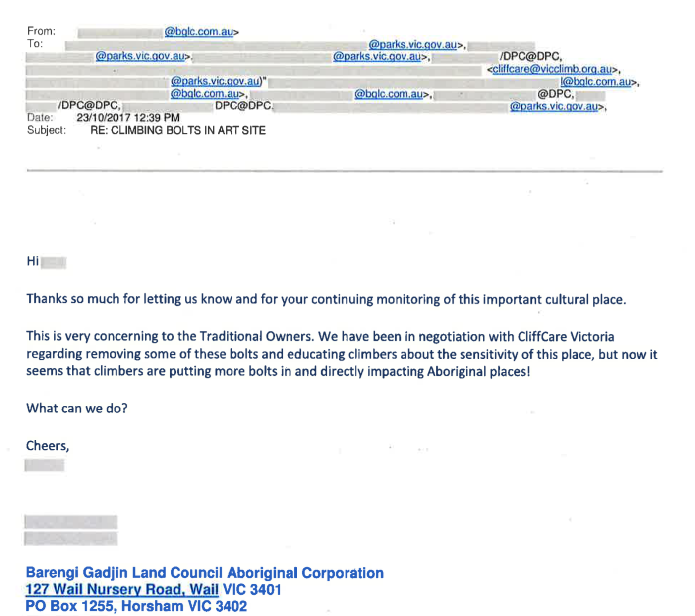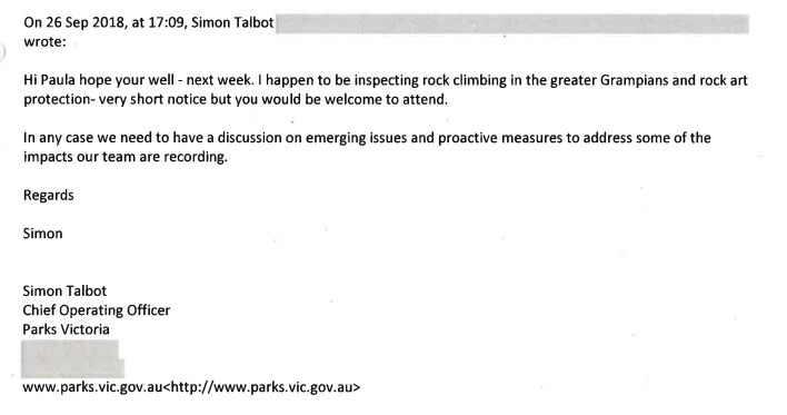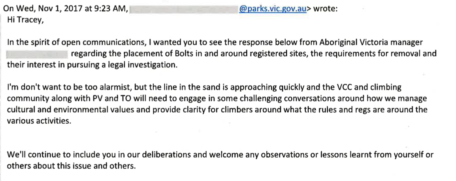 We start with an illuminating email sent in July 2017 (1.5 years before the bans were announced). In it, the unidentified author from Dept of Environment forwards a paragraph presumably drafted by someone in Aboriginal Victoria (AV) explaining the legal obligations of rock climbers and land managers under the Aboriginal Heritage Act 2006.