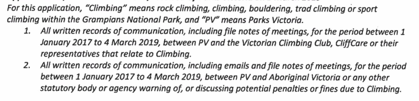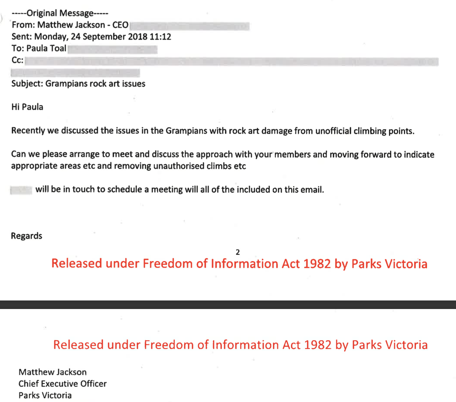 The first query was for communications between PV and Victorian Climbing Club/CliffCare. For this they released all 48 pages that were” found to be relevant” – and only did some minor redactions on 42 pages, mainly just blacking out individuals names and identifying details. Fair enough.