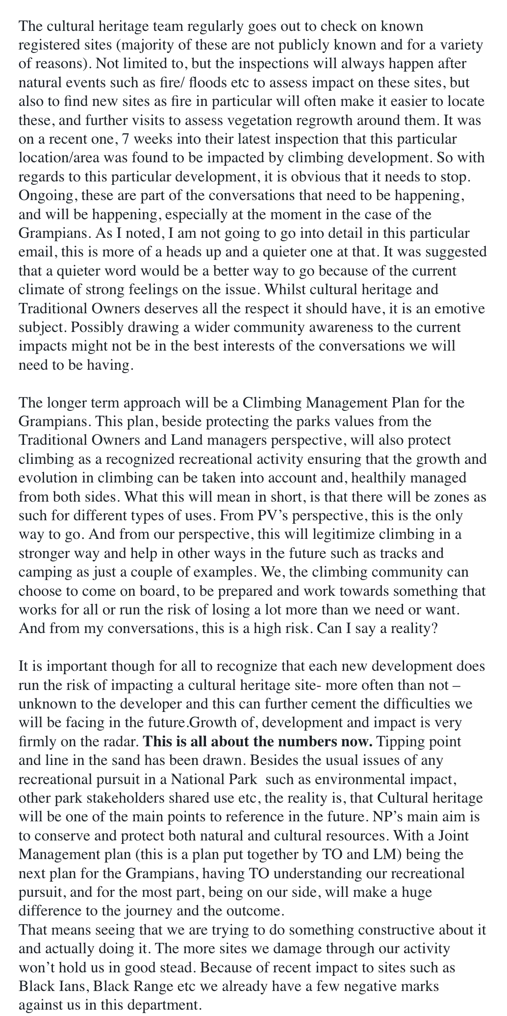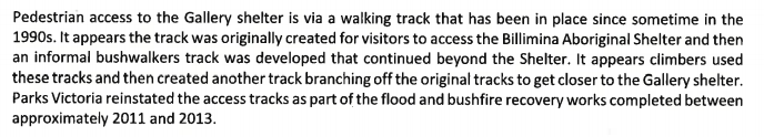 The email explains to Aboriginal Victoria the actions they have taken to protect the quarry site at the base of The Gallery. What is intriguing is the way this document is written. It makes it sound like the bolts and chalk are new developments – whilst the reality is they had been there for 25+ years and PV had even built a walking track up to the climbing area as recently as 2011.
