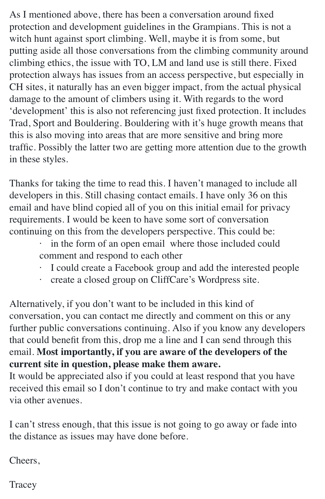 What is strangely missing in these FOI emails is something that was sent to new route developers about 10 months after the Black Range incidents. Tracey sent the following email – and refers to discussions with PV. Those discussions were not included in the FOI documents. There was clearly work being done but what exactly? The email from Tracey to developers was the first time hints of a ban or restrictions were being raised.