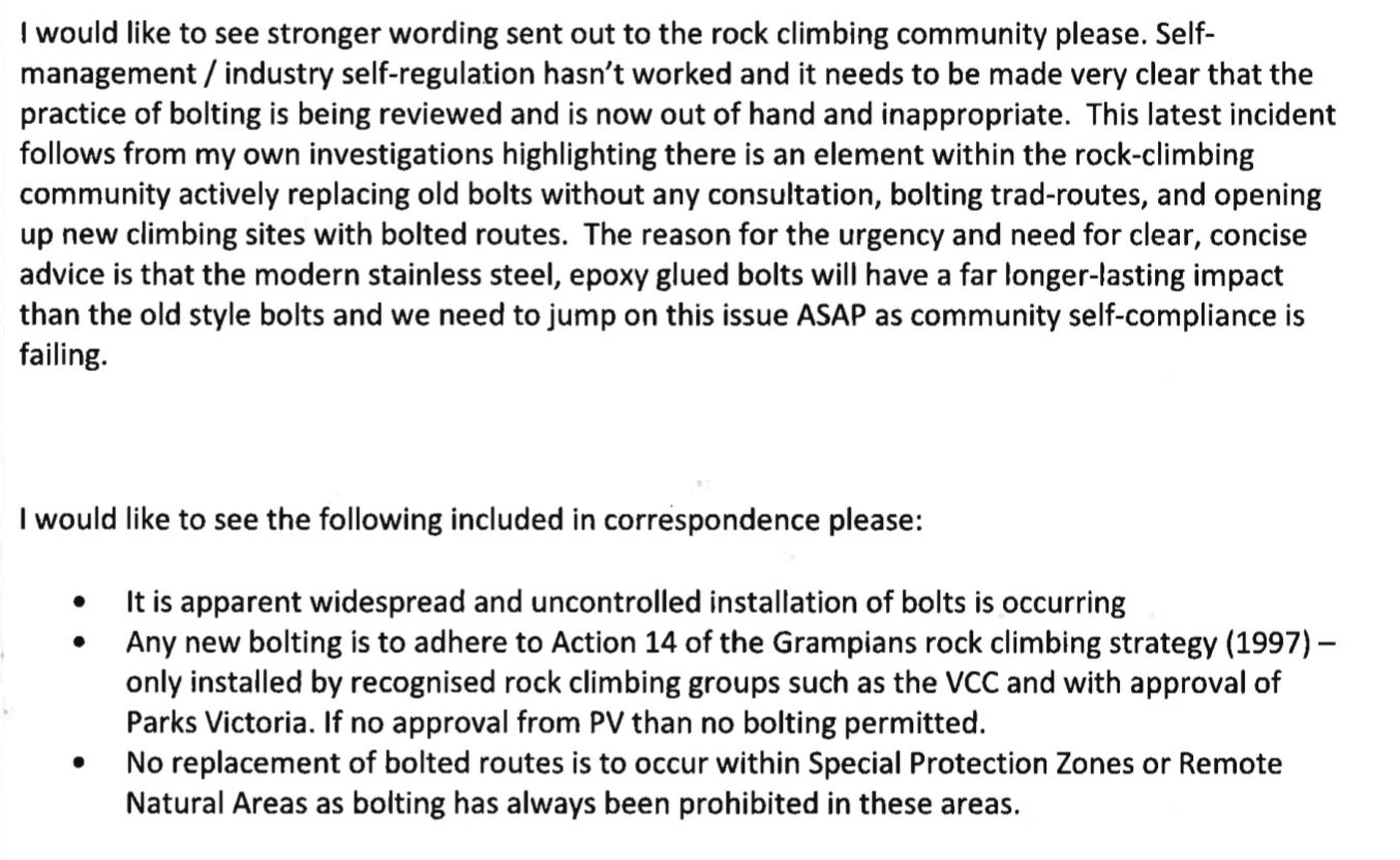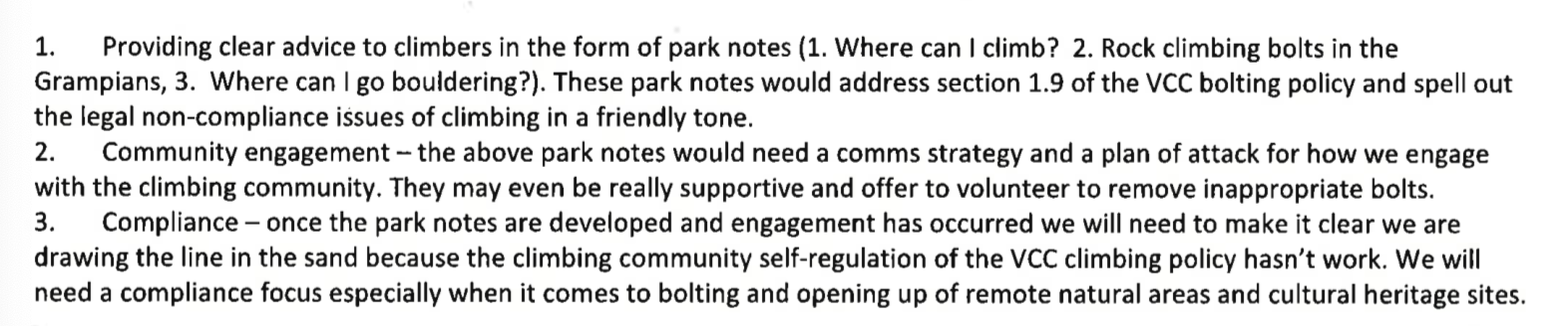 Right down the bottom – they clearly say they want to fast track communication saying that all bolting is banned immediately in the Grampians and Black Range. And alarmingly this needs to be done before the “bigger picture” project will be complete. What project is that? There is no mention in other documents. This is all happening in November 2017 – still 16 months from the climbing bans being announced in February 2019. Was the SPA ban the “bigger picture” plan that was being kept secret? or something even more sinister we have yet to know about?