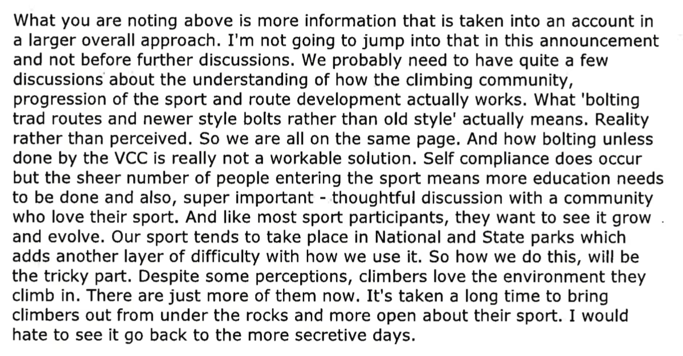 Some interesting tidbits there – a hope that climbers would be “Really supportive and volunteer to remove inappropriate bolts”, “self-regulation of the VCC climbing policy hasn’t worked” and that PV will need “a compliance focus”. Remember this is more than a year before the first inklings of this were leaked to climbers via the “rogue ranger” handing out draft maps showing banned areas at Muline.