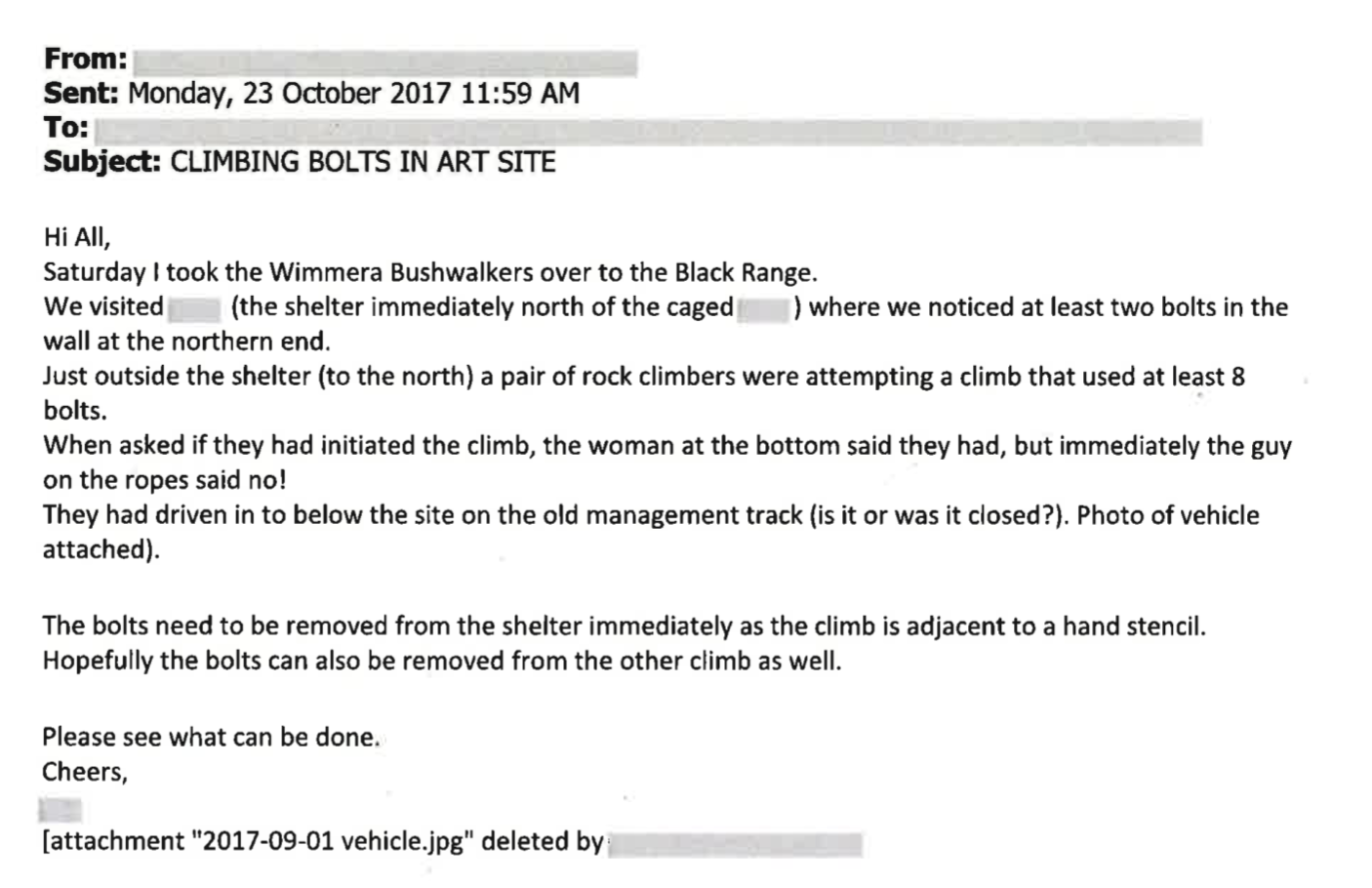 Three months later, the documents reveal correspondence regarding the Black Range bolting issues – where several bolts were placed near (not in) Aboriginal art sites in early 2017. The first email comes direct from an unidentified person (possibly Ben Gunn?) who stumbled upon climbers and new bolts near a caged art site…
