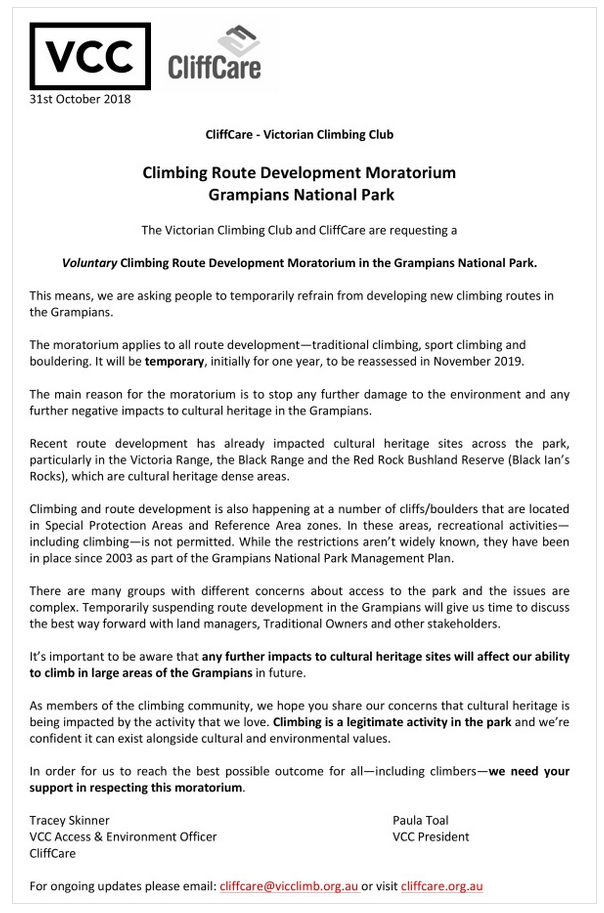 Please share, comment etc to help spread the word about the Grampians bans. And join Victoria’s dedicated climbing access group the ACAV and donate to CliffCare.