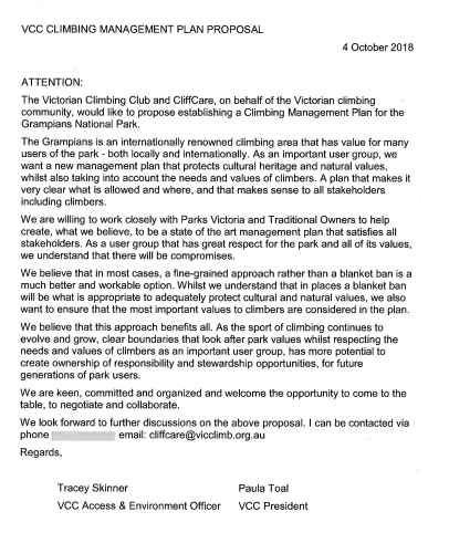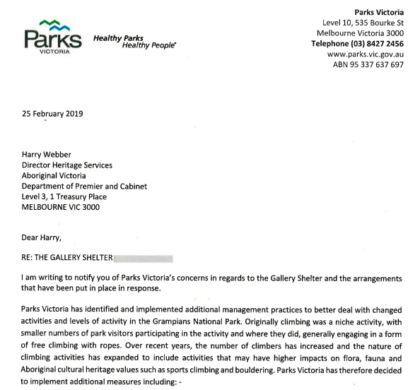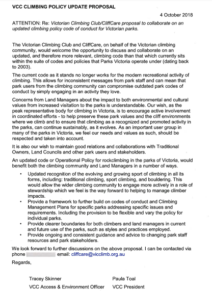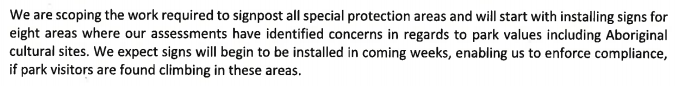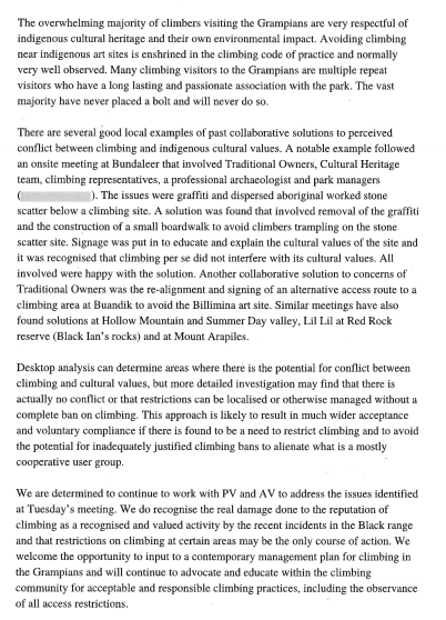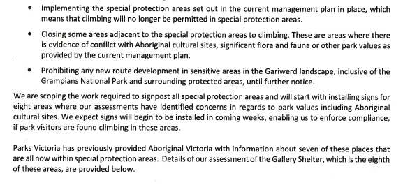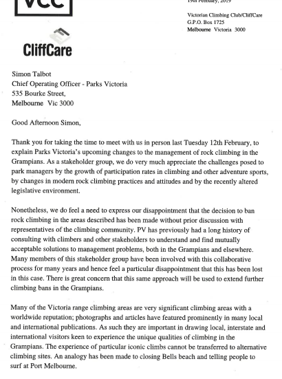 This was a great letter from the VCC, spelling out clearly the reasons for climbers concern and the past collaborative approach to climbing management. The fact that PV failed to give any advance warning of this plan is damning. They had taken photos, done cultural assessments, created maps and media plans but failed entirely to discuss this with the only usergroup to be affected – climbers. Imagine the government did the same thing to fisherman? Or surfers? Or bike riders? Banning half of the areas that the sport is practiced in – but not telling anyone until the Friday night. Case closed. Suck it up. It’s pathetic management and honestly needs a proper investigation by higher levels of the government.