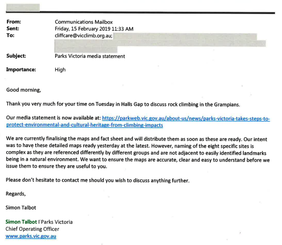 The last few documents in the FOI release were just notes from the Feb 12th meeting between the VCC and PV (where the bans were announced, but the locations were not). They don’t reveal anything of note. The last document is an email between Tracy and PV stating, with some level of concern, that PVs maps were not good enough to inform climbers where they could and couldn’t climb.