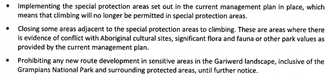 It’s clear straight away that climbing in SPA is to be banned – this is no grey area. They also want to ban areas “adjacent to the special protection areas”. New routes are also to be prohibited throughout the park and surrounding areas. This sort of clear message however was not said in media releases and Fact Sheets issued by Parks Victoria. For months climbers believed SPA bans were merely an unfortunate bureaucratic oversight and would be removed in the next management plan. Yere no. That is clear when you read the next paragraph.