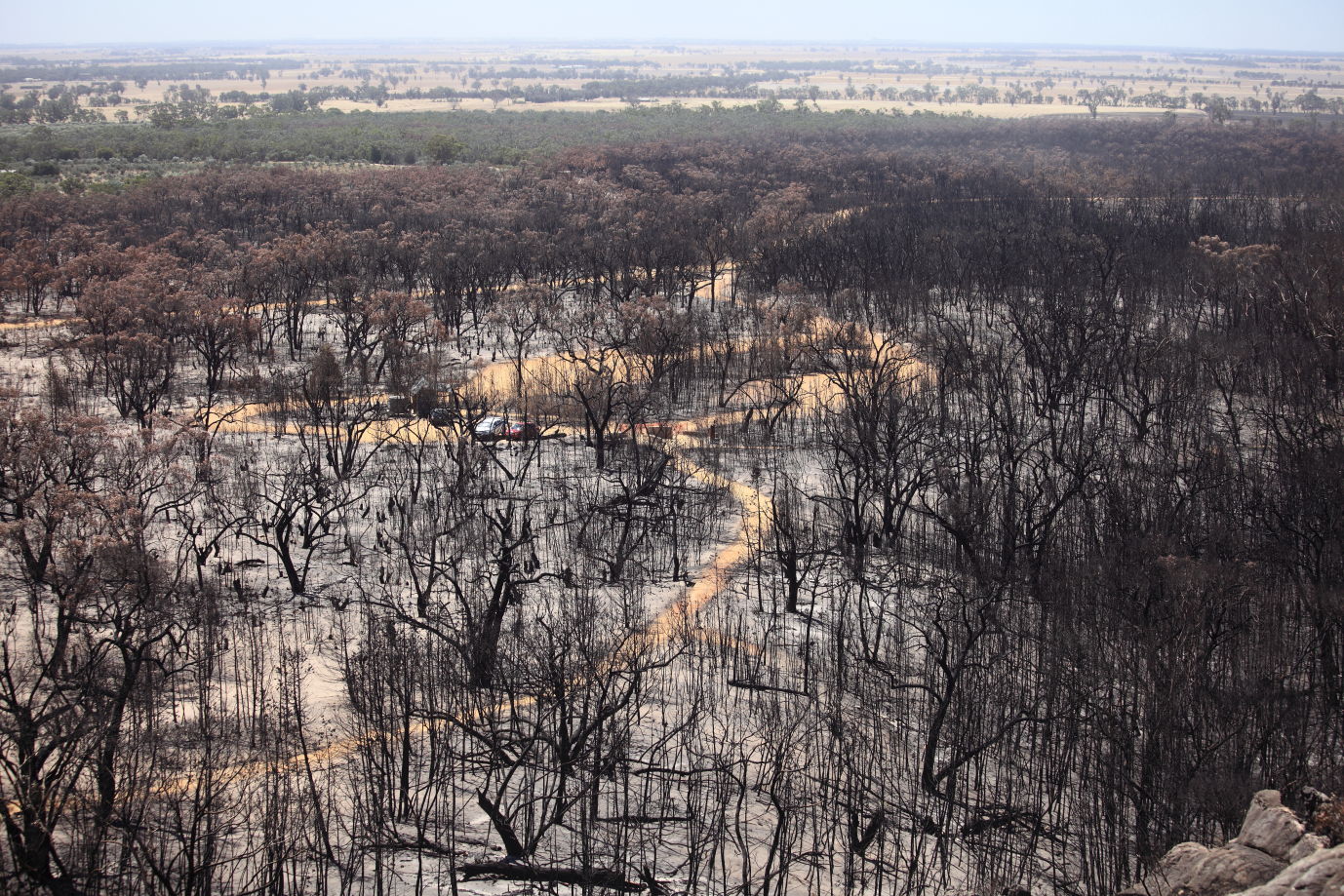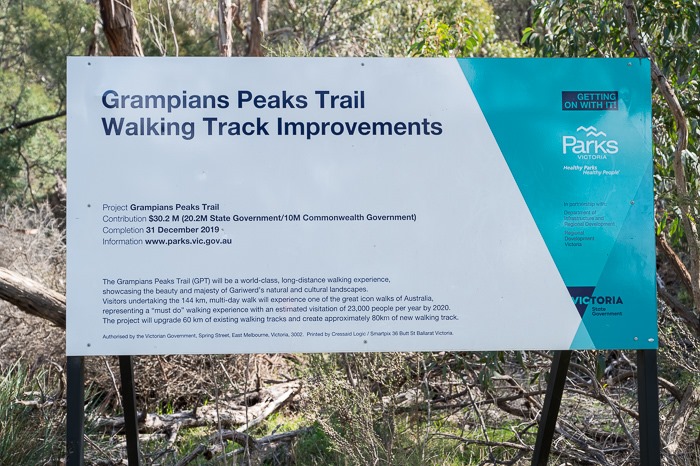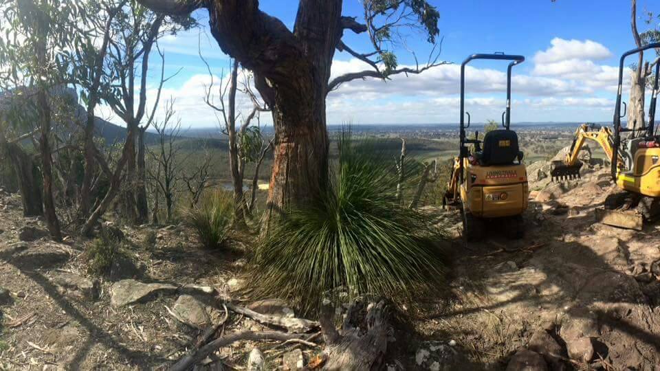 Parks Victoria’s claim that climbing should be banned because of environmental impact flies in the face of their own actions. The biggest group damaging the Grampians is Parks Victoria. It’s all part of a push from the government and commercial tourism groups to attract more visitors and thus more dollars. As Kevin Costner so famously said “if you build it they will come”. A bigger carpark attracts more cars. Make it easier to walk to somewhere by installing a paved track and ladders and more people will walk there. The following photo essay is snapshot of the kind of damage PV is routinely allowing in the name of “progress” and “growth”. Much of the recent damage they so proudly promote is from the Grampians Peaks Trail® – a 144km walking track being constructed over the next few years – with attached luxury lodges. This isn’t just connecting old walking trails together – over 83km of new track is being cut, bulldozed and jack hammered through virgin bush to attract more tourists and their $$$. You can watch some of the private contractors working on the Peaks Trail in this promotional video:
