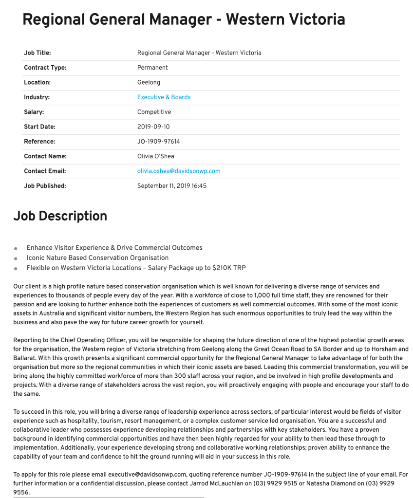 Some of our favourite lines are “looking to further enhance both the experiences of customers as well commercial outcomes.”, “you will be responsible for shaping the future direction of one of the highest potential growth areas for the organisation”, “With this growth presents a significant commercial opportunity for the Regional General Manager to take advantage of for both the organisation but more so the regional communities in which their iconic assets are based.”, “Leading this commercial transformation, you will be bring along the highly committed workforce of more than 300 staff across your region”, “You have a proven background in identifying commercial opportunities“