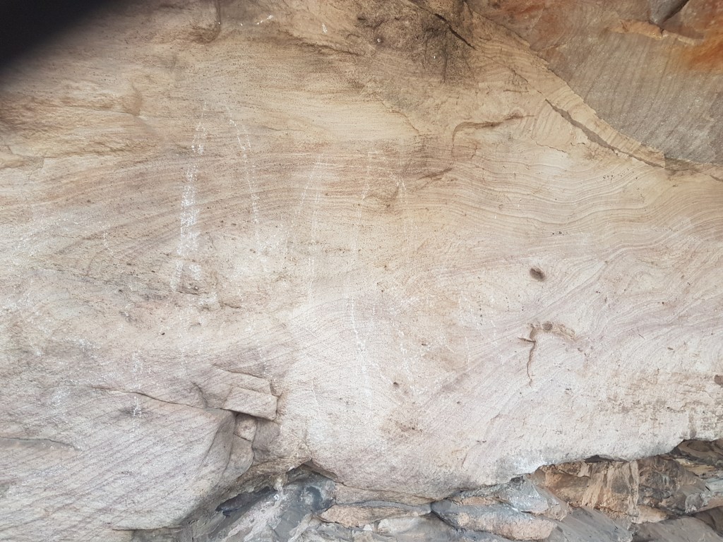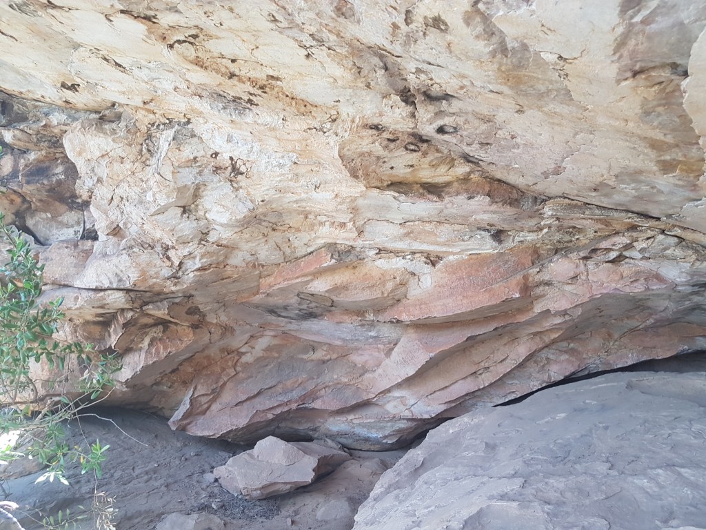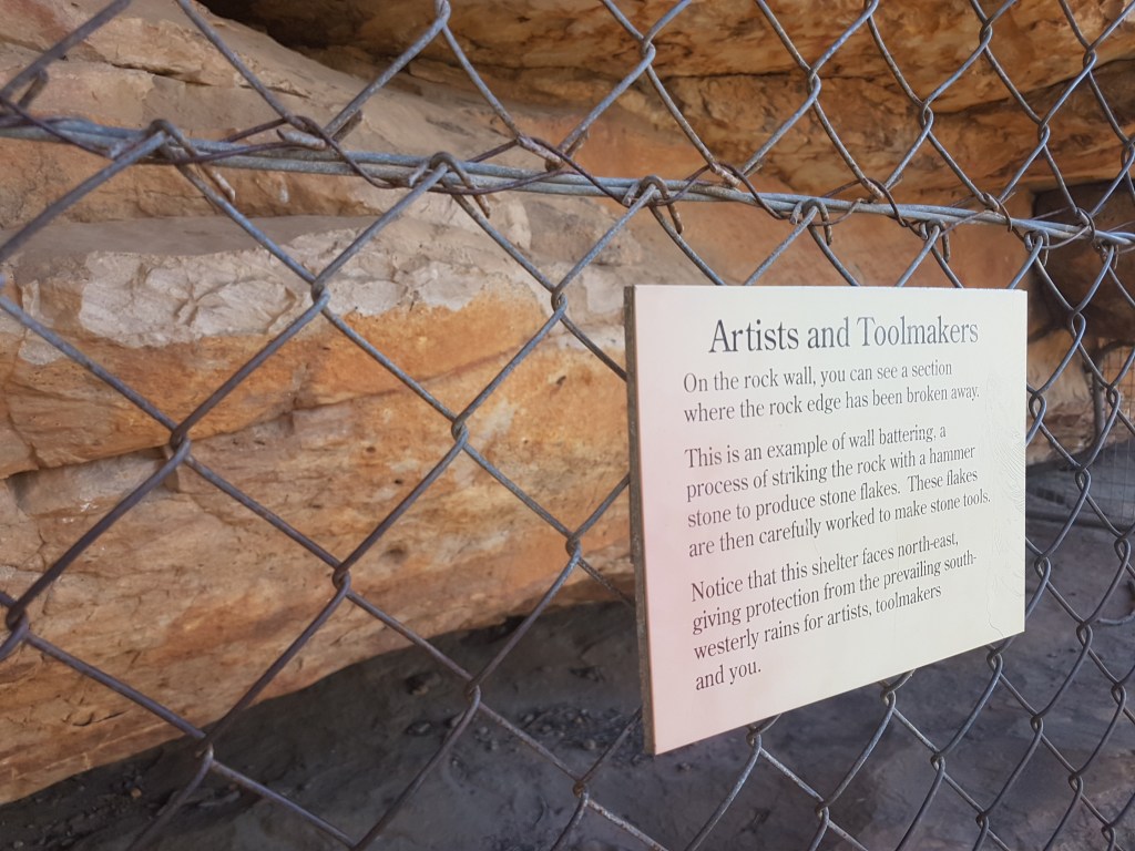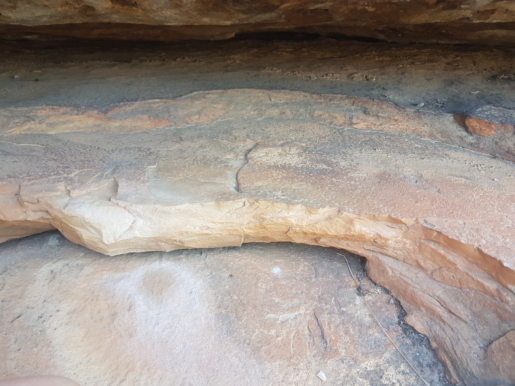 Typical Aboriginal stone tool quarry site near the caged art site. It’s important to note that the dirt floors of caves like this contain invaluable archeological material as well – stone tools, charcoal from fires and bones. This is why climbers need to be careful about erosion under caves.