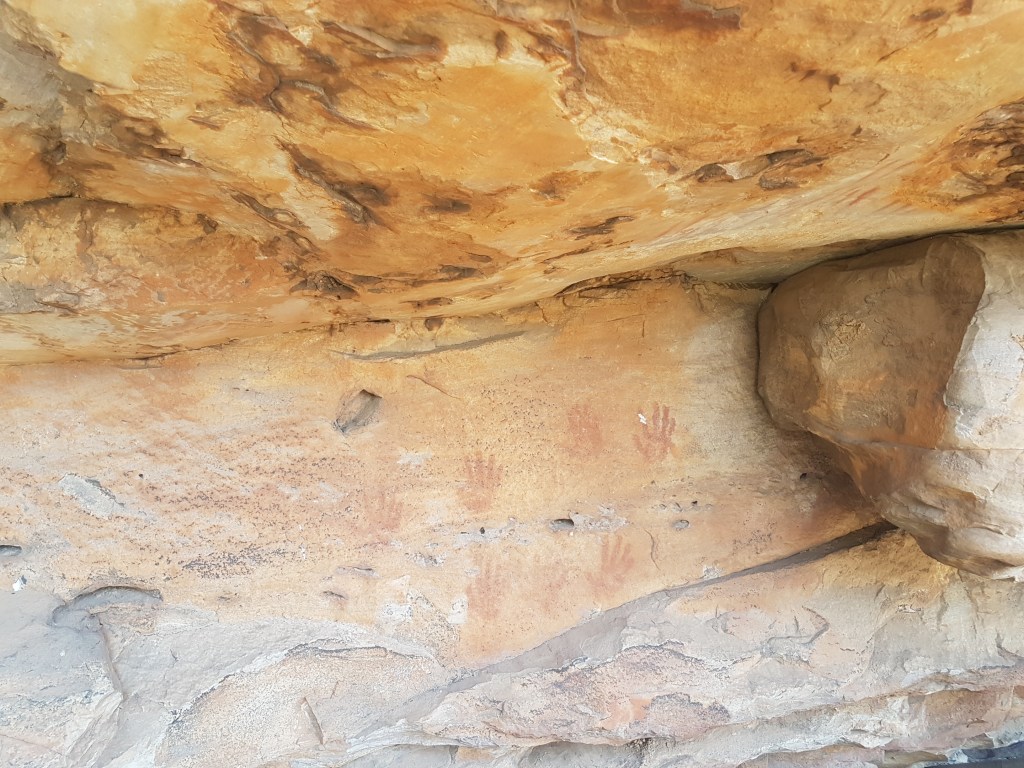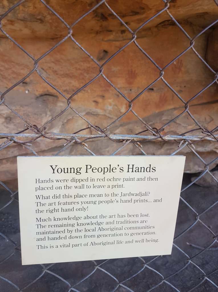 The book says there are 26 hand-prints in Gulgurn Manja, all being right-hands and most being small enough to be young people. There are also paintings of numerous emu and kangaroo tracks in the cave.