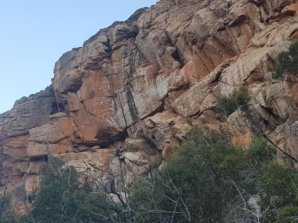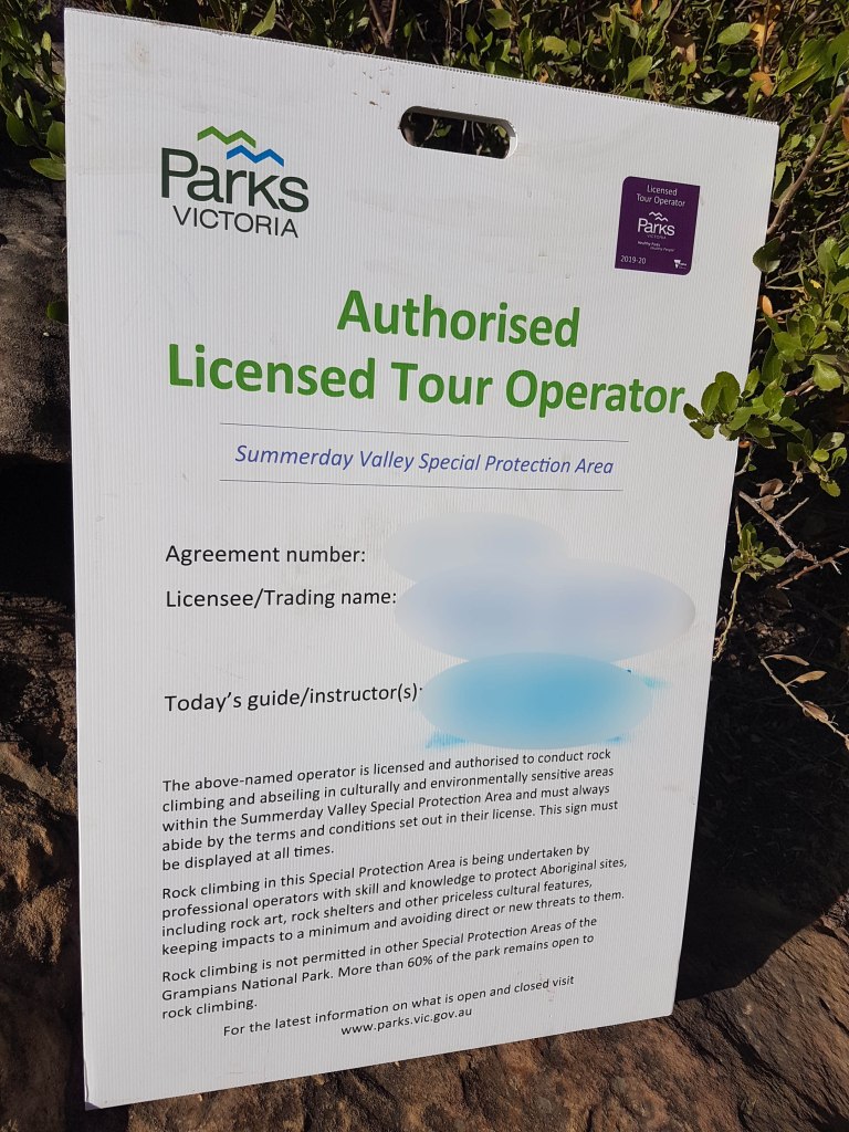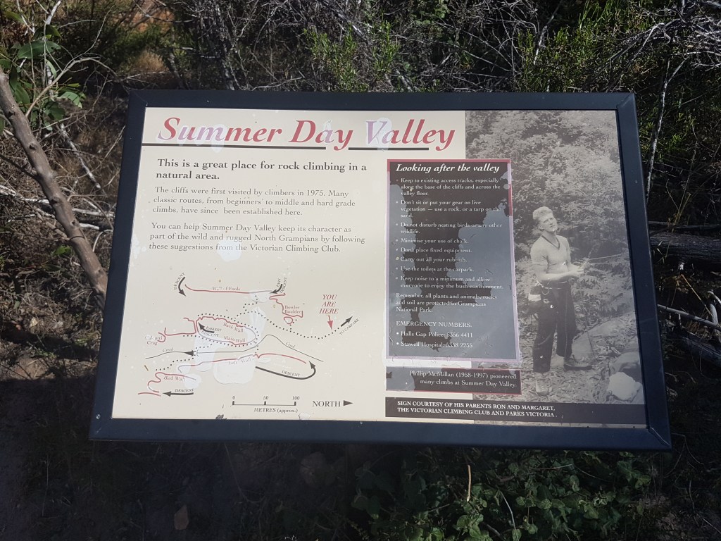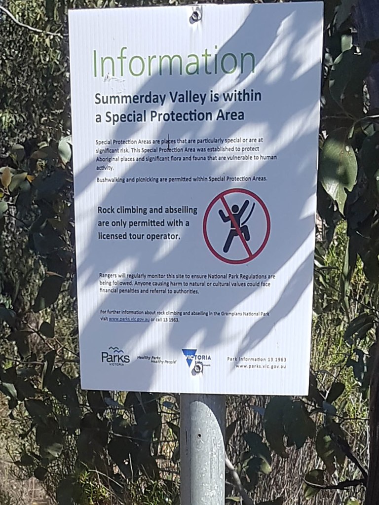 Next day was a visit to Summer Day Valley, an area at the heart of the climbing ban issues. For more than 40 years it was the Grampians most popular climbing area due to the very short approach, good trad protection, top-rope accessible and multiple wall directions allowing all day shade or sun as required. Since February 2019 it has been shut to recreational climbers because it is inside a Special Protection Area where climbing is prohibited according to PV. Summer Day has also been a popular commercial guiding venue over the last couple of decades, and these operators have been allowed to continue working in SDV despite the ban. To keep access they have to follow new strict requirements including pre-booking sections of the crag with PV, on site signage and cultural inductions. We were keen to check out these inductions in person but unfortunately, at the last minute, these inductions were cancelled so we can not report on them (which was the main reason we were visiting).