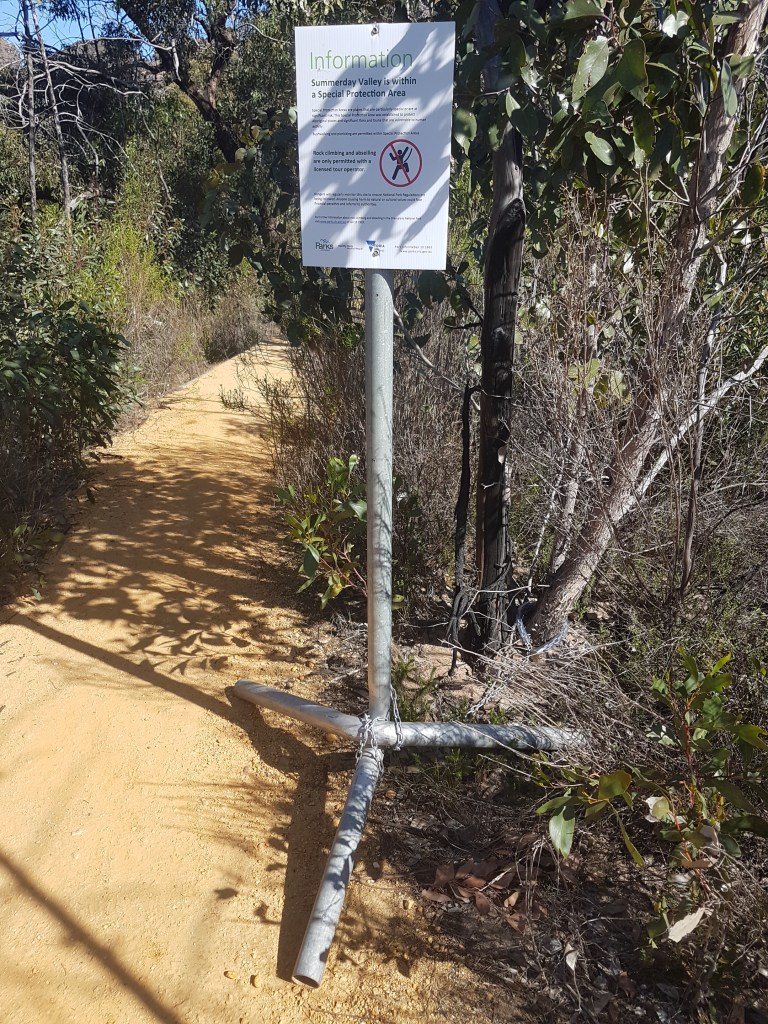 Summer Day Valley is approached by short 100m walk from the Hollow Mountain Carpark along a track built by Parks Victoria. The track was re-routed after the 2014 fires to keep it away from the creek-bed. The first thing you see is this sign chained to a tree explaining that “rock climbing and abseiling is only permitted with a licensed tour operator.”