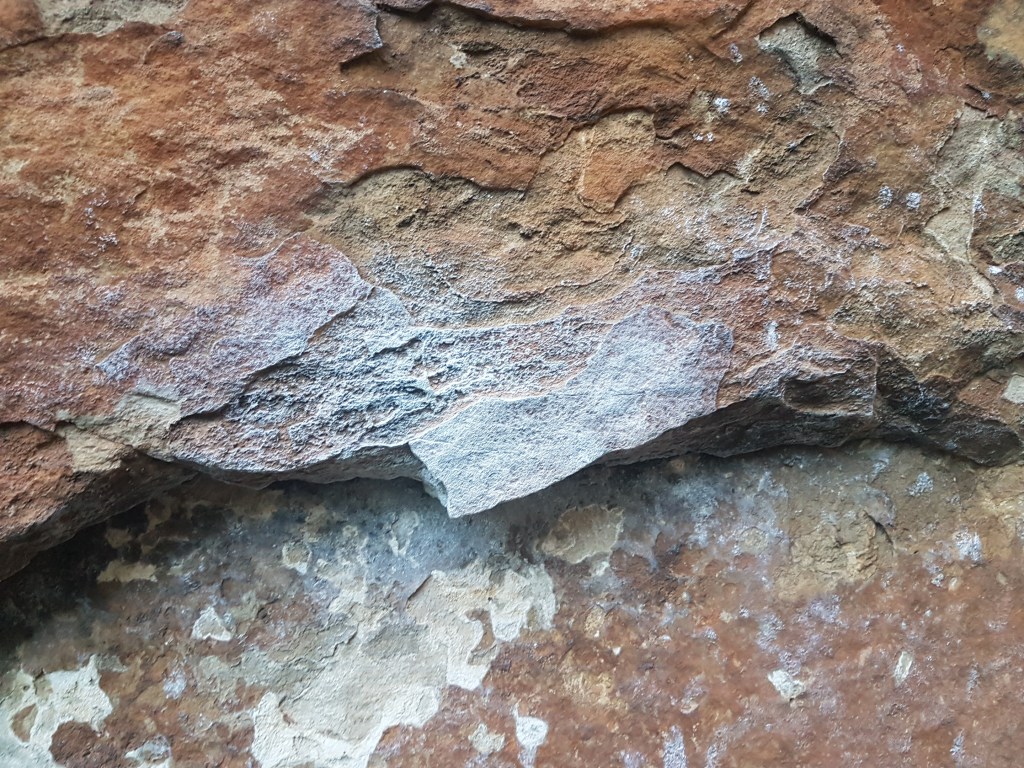 We then went for a walk to Wall of Fools to try and locate the Aboriginal stone tool quarry site that had been rumoured to exist there and has alledgely been one of the causes of the recent bans. None of the details are public knowledge and have ever been released officially. We only know about this from comments made by PV staff in meetings held in Halls Gap with tour guides. In general the rock on that wall is soft sandstone (thus the extreme weathering with the big jugs on the left and right sides) – but in the middle we did find some sections that appeared( to an untrained eye) to be the broken rock edges in question. There did not appear to have been directly impacted by climbers as they were at ground level and tucked under a small overhang.