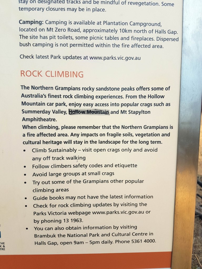 As most international or interstate climbers would do, we drove from Arapiles to the Grampians. It was hot, really hot. 36’C when we pulled into Hollow Mountain Carpark at 2pm on a Tuesday. It could easily fit 50 cars and several tour buses, but instead it was completely empty apart from one lone mini bus baking in the sun. A read of the glossy Parks Victoria interpretative signs didn’t reveal any messaging about the SPA climbing bans that cover the majority of climbing accessible from this carpark. If there were bans they certainly weren’t making an effort to advertise this. The only sign of trouble was an attempt to black-out the word Hollow Mountain with a Sharpie.