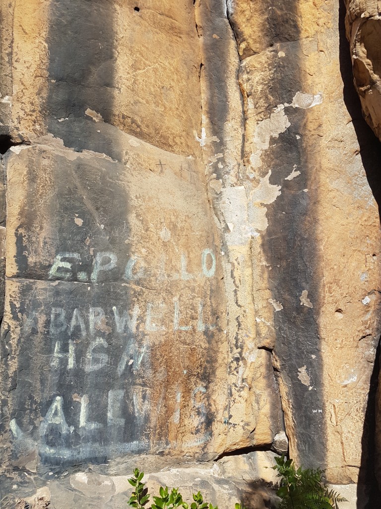 This is 102 year old “graffiti” along the base of the cliff that predates modern rock-climbers by about 60 years.