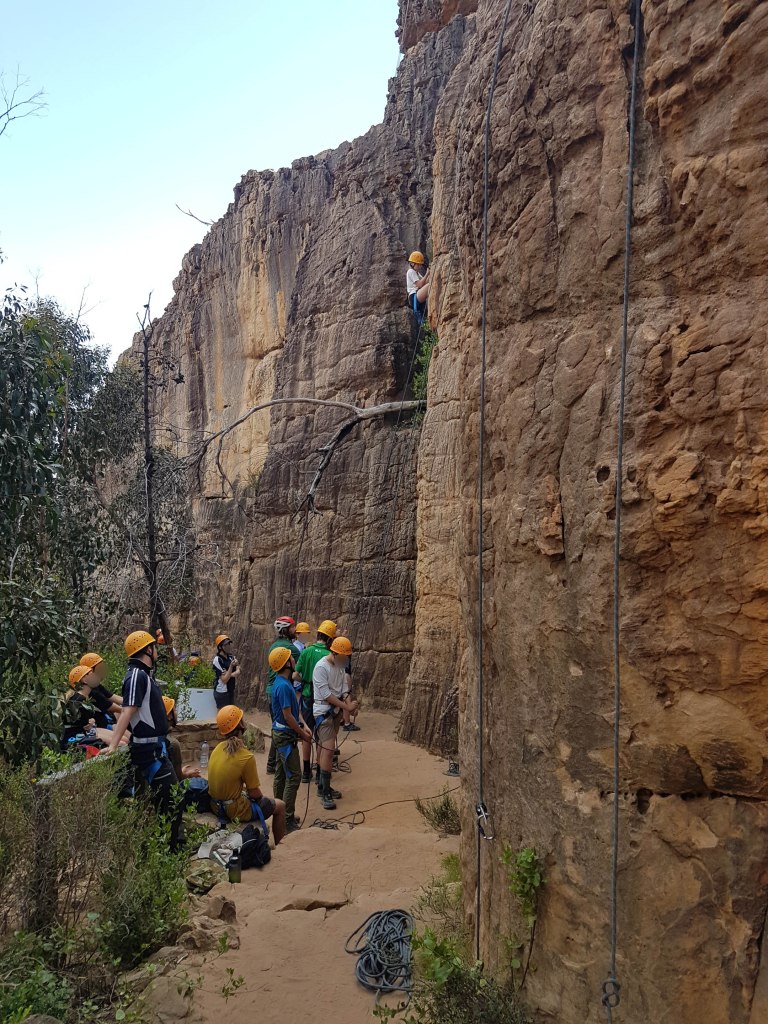 Jokes aside, there were three Licensed Tour Operator groups working inside the valley on Back Wall and left side of Wall of Fools, and apparently another group operating on the BARC cliff which we didn’t see. Each of these school groups consisted of 15 or so students and a couple of climbing guides. Doing a rough head count at lunch we think there was approximately 60 students and about 10 adults in total. At peak period there was about 15 top-ropes set-up on almost every available easy route.