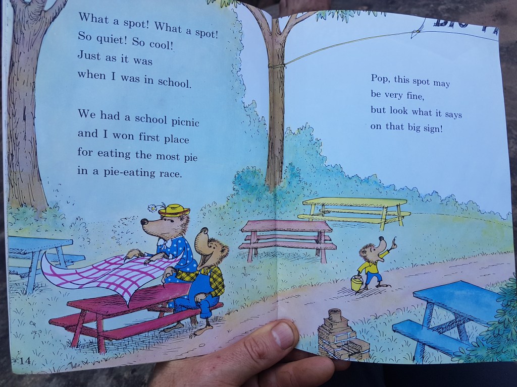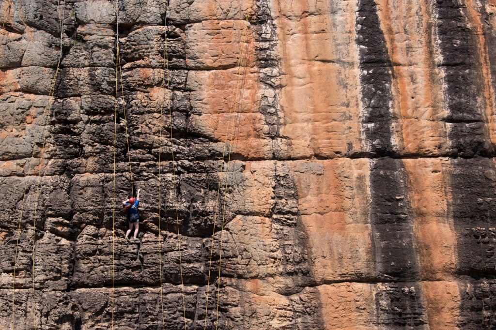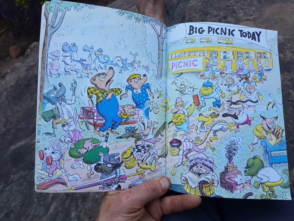 By 8am the first school groups started emerging into the valley, with guides starting to pop their heads over the cliff edge and throwing ropes down. There was a brief moment of yelling when one group was confused about who had booked which wall. The picnic book we were reading at the time summed it up rather well.