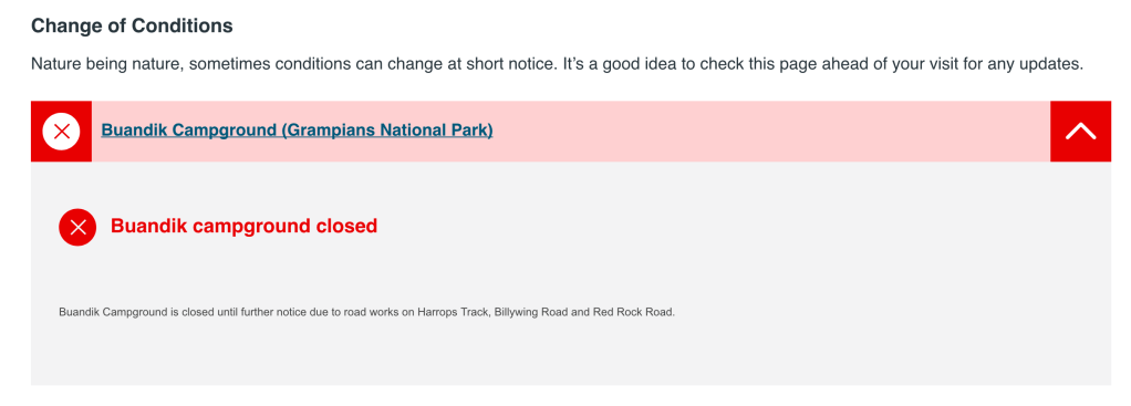 We did as their sign suggested and logged on to Parks Victoria’s website to see if there was any updates about climbing (a struggle with poor mobile reception). Again there was no information readily available. The only “need to know” they listed for the entire Grampians was the closure of Buandik Campground – entirely irrelevant. The dedicated Northern Grampians page doesn’t even mention rock-climbing despite it being home to Taipan Wall and numerous other world-famous climbing areas. It’s like they want to pretend climbing does not exist. Later in this article we will talk about our impression that the majority of people visiting this area mid-week were climbers, on the three day trip we were there it was easily a ratio of 10:1 climbers to non-climbers. So this lack of info was concerning.