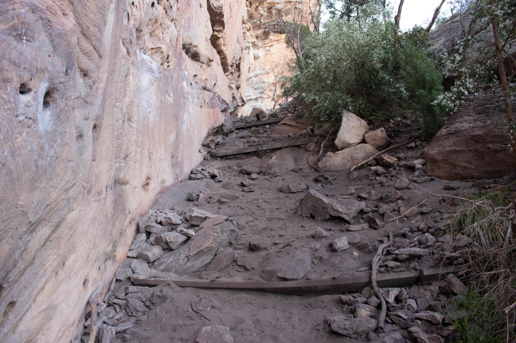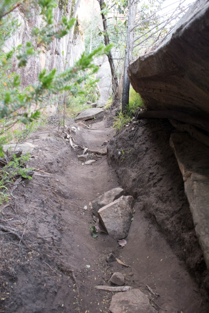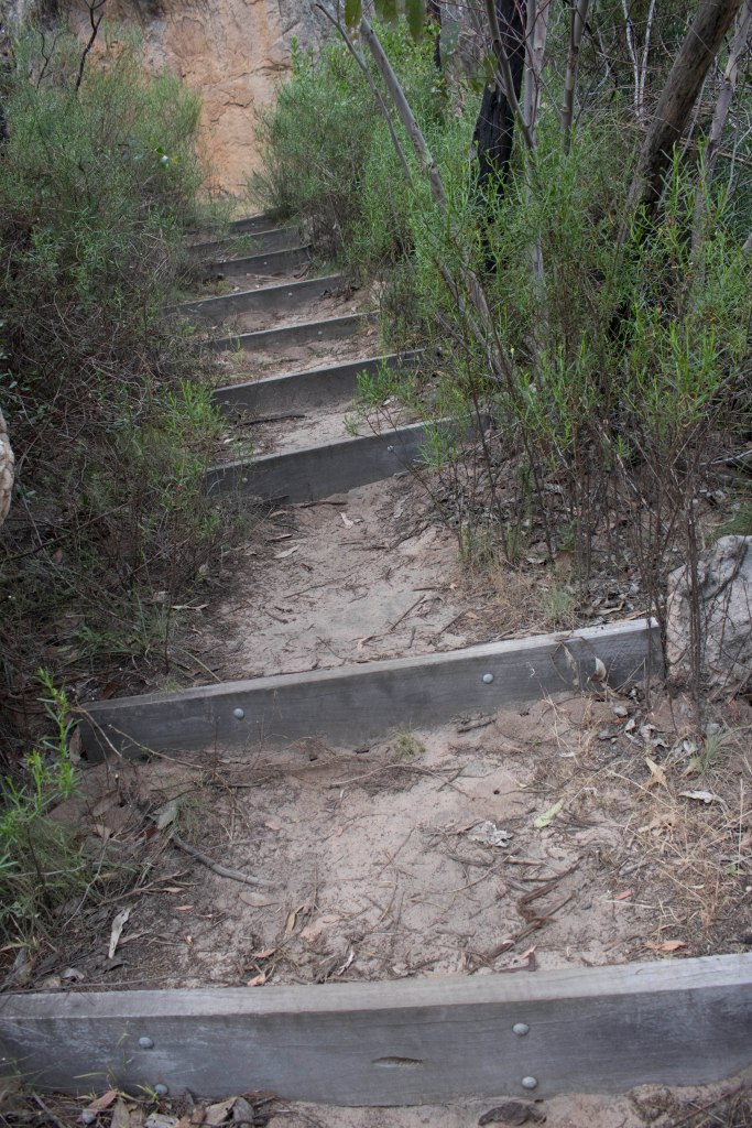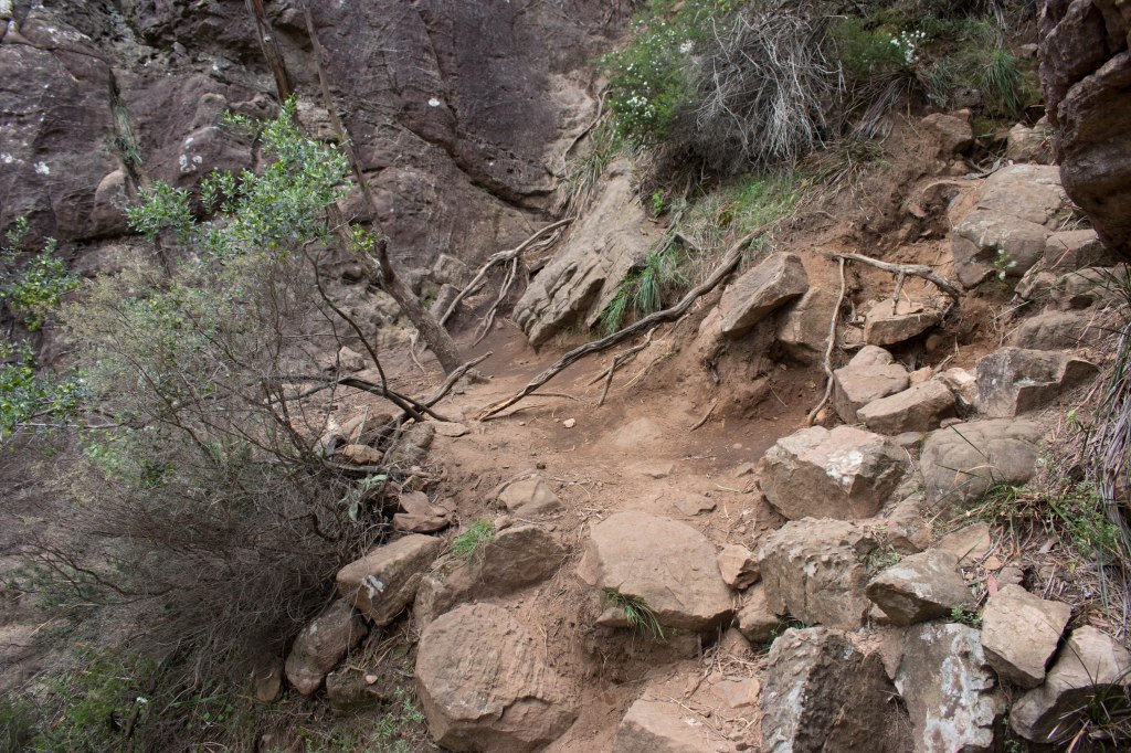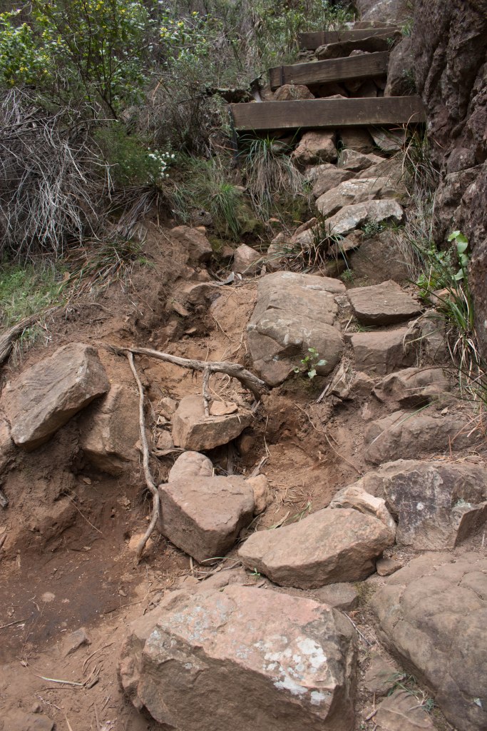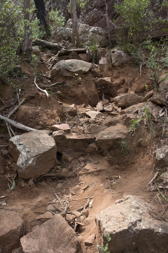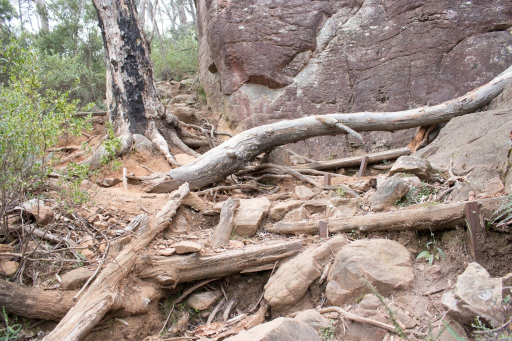 After cleaning up at Trackside we followed the climbers track up to the so called world’s best cliff – Taipan Wall. This track had some erosion control measures (steps and a wooden ramp) installed in 2007 by CliffCare and PV. For the most part it is in good condition because of this – but one section requires urgent attention.