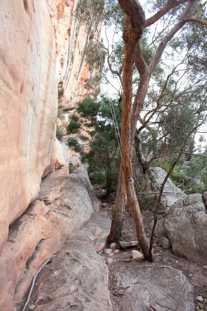 The bushfires a decade ago really destroyed the base of this crag – trees that once held together the ground are now all but gone leaving an unstable and soft surface. Stone steps, belay platforms – all solutions need to be considered. Planting some trees and fencing off sections for regeneration is urgently required here.