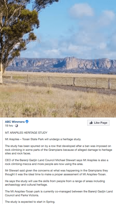 There is also current negotiations underway between BGLC and the State Government of Victoria under the Traditional Owner Settlement Act. It is likely that a settlement will include a change from co-management to joint management for Arapiles. This means the title of the land passes from State Gov ownership (i.e. the general public) to BGLC under a form of land title called Aboriginal Title. You can read lots more about this in our article Is Arapiles Next?