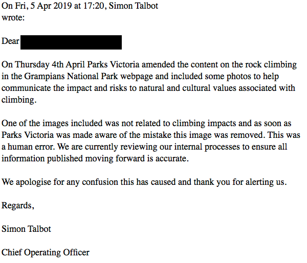 On Thursday 4 April 2019, Parks Victoria published photos onto its website to help communicate the impact and risks to natural and cultural values associated with climbing. One image was not related to climbing impacts and when Parks Victoria was made aware of the mistake, the image was removed. This was a human error. Parks Victoria subsequently sent a letter of explanation and apology to the Victorian Climbing Club and media outlets. Admission of this error was published in multiple media outlets, including The Australian, The Age, ABC and the Herald Sun. Parks Victoria has not wilfully communicated any other inaccurate information.