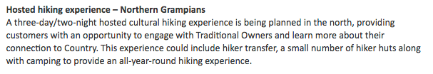 Notice how they slipped in the ambiguous “small number of huts” into the document? There is no information on how large these huts are, their exact location or the actual number of huts that will be built. We do know it is apparently in the Northern Grampians – home to Taipan and Hollow Mountain. These huts cannot be used by the general public unless they are on a “hosted hiking experience”. This is a clear example of the commercialization of the Grampians being slipped through without scrutiny.