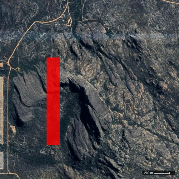 What does that equal? An area one kilometer wide by 140m across. We will make it easier for you to visualize. Below is the area transposed over Mt Stapylton and Hollow Mountain.