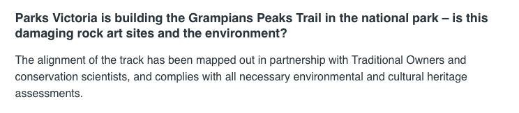 The company I work for was approached by PV to assist with the planning phase of a ‘sky walk’. An elevated walkway bolted to the side of a cliff face in the Grampians National Park. I imagine quite a few safety bolts would be required for this. PV hypocrisy at its finest.
