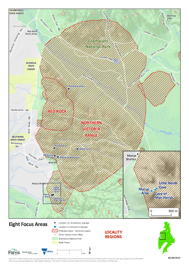 The regulations from the Grampians National Parks 2003 management plan have been in operation for over 15 years, including the exclusion of rock climbing from the Special Protected Areas (SPA) of the northern Victoria Range (Fig. 1). This SPA was extended further in February 2019 to embrace a further cluster of rock art sites. However, as the significance of SPA’s was poorly communicated by Parks Victoria and policing never enforced, rock climbers and the broader public had little awareness of these restrictions or the reasons for why they were in place (although, all groups had had the opportunity to comment on the original draft of the management plan).