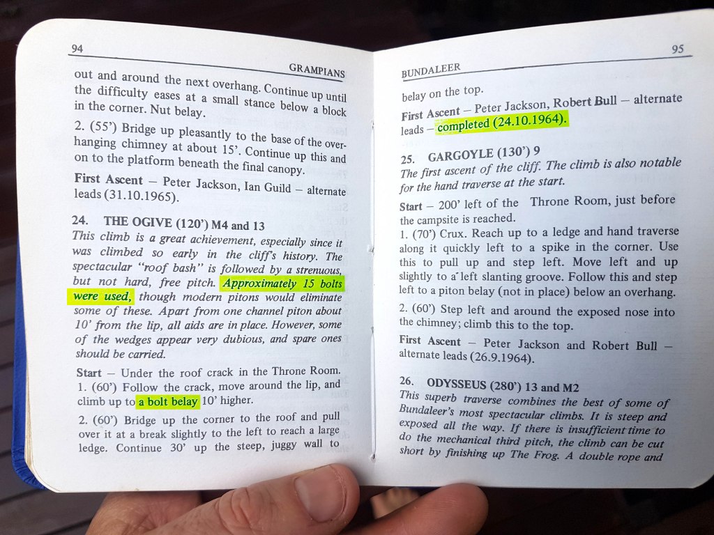 We also see mention of the Czech Republic climbing areas where safety bolts, chalk and even metal trad gear is prohibited. There are two points to be made here. The Czech model of strict ethics is very much the outlier in the world climbing stage. There are no climbing areas in Australia with such strict ethics. There are a few crags with a self policed no-bolt policy (e.g. Ben Lomond in Tassie) but chalk and metal trad gear is used at every climbing area in Australia. For every Czech crag there are tens of thousands of areas with similar levels of chalk and safety bolt use to the Grampians. The second point is that the Grampians climbing community have broadly accepted the use of safety bolts and chalk since the earliest times when this technology was introduced to the rest of the world. At places like Bundaleer there are rusty bolts from the very early 60s still in place (predating the declaration of the Grampians National Park by 25 years). Check out this route description from the 1968 Rock Climbing Guide to the Grampians Volume 1.