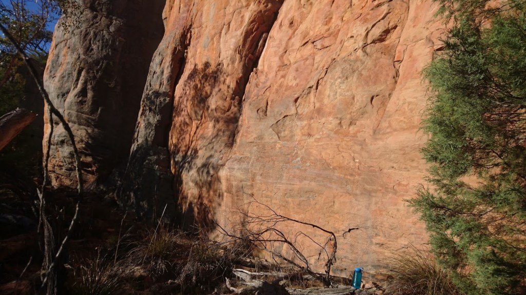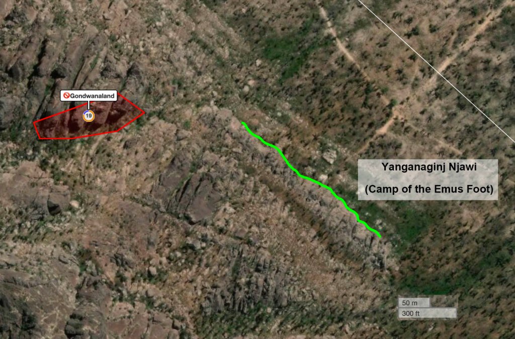 Yanganaginj Njawi (also listed as Jananginj Njani) is an art site once popular with tourists that appears to have been decommissioned by Parks Victoria about 20 years ago. In the ’90s & ’00s the access road was open and labeled “Camp of the Emus Foot”. At the end of this road, where you parked for Weirs Creek or Gondwaland climbing areas, was actually the old tourist carpark for the art site. Original access for Gondwanaland was to walk up to the caged art site and then traverse across under the cliffline for 300m then hike up the steep gully to arrive at the Gondwanaland cliffline. Later climbers walked directly up from the road rather than traversing thanks to bushfires clearing the scrubby vegetation in the gully. This climbing area contains no obvious caves suitable for art. The base of the cliff is vertical to slabby and vegetated. The routes are mixed climbs and the bolts are way off the deck. There doesn’t seem to be any harm done to cultural heritage at Gondwanaland. But because no information has ever been shared about assessments or cultural heritage in this area with the general public we just don’t know.