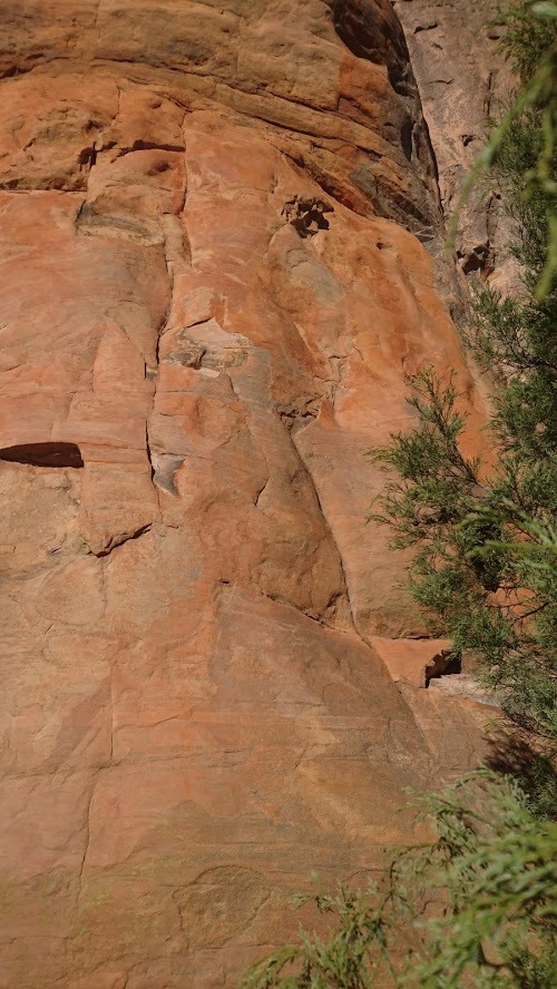 There is one piece of rock art, an emu’s foot, in the middle of the lower cave. No climbing routes cross this piece of art. It remains untouched by climbers (and is not signposted). There are safety bolts and chalk in the rest of the cave. Harm done by climbing via proximity? OK.