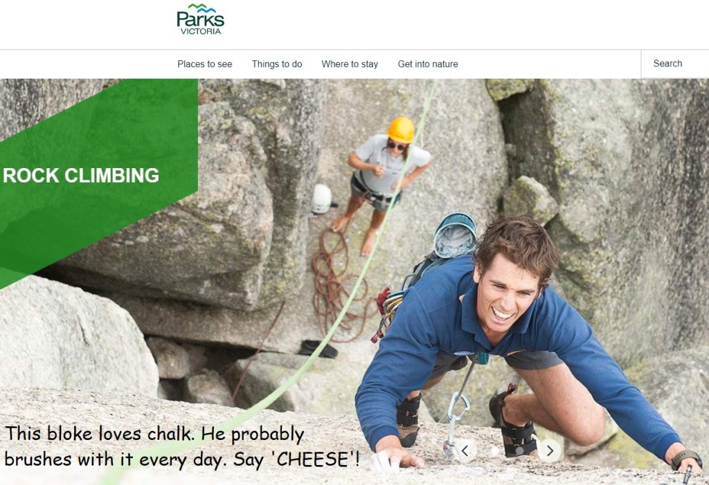 Parks Victoria has known about and accepted the use of these safety aids for decades. Just last week PV’s own website had this great photo of someone clipping bolts and using chalk at Mt Buffalo as their cover image on their generic rock climbing information page: