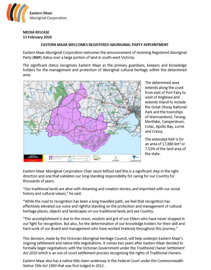 This week Eastern Maar announced a major win for them with the receiving of Registered Aboriginal Party (RAP) status over a large section of south western Victoria (7.53% to be exact). The map shows the Grampians is not included.