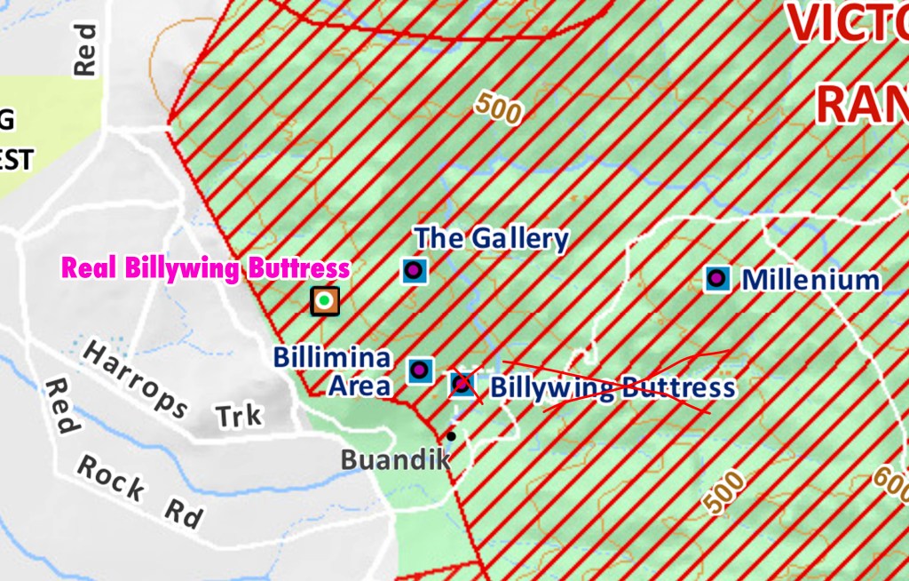 Now this is an interesting one. There is a climbing area called Billywing Buttress but the poor quality maps provided by Parks Victoria show it to the east of Billimina area – over near Cultivation Creek. The real Billywing is north-west of the Billimina and 1.2km away from where it is marked on the map.