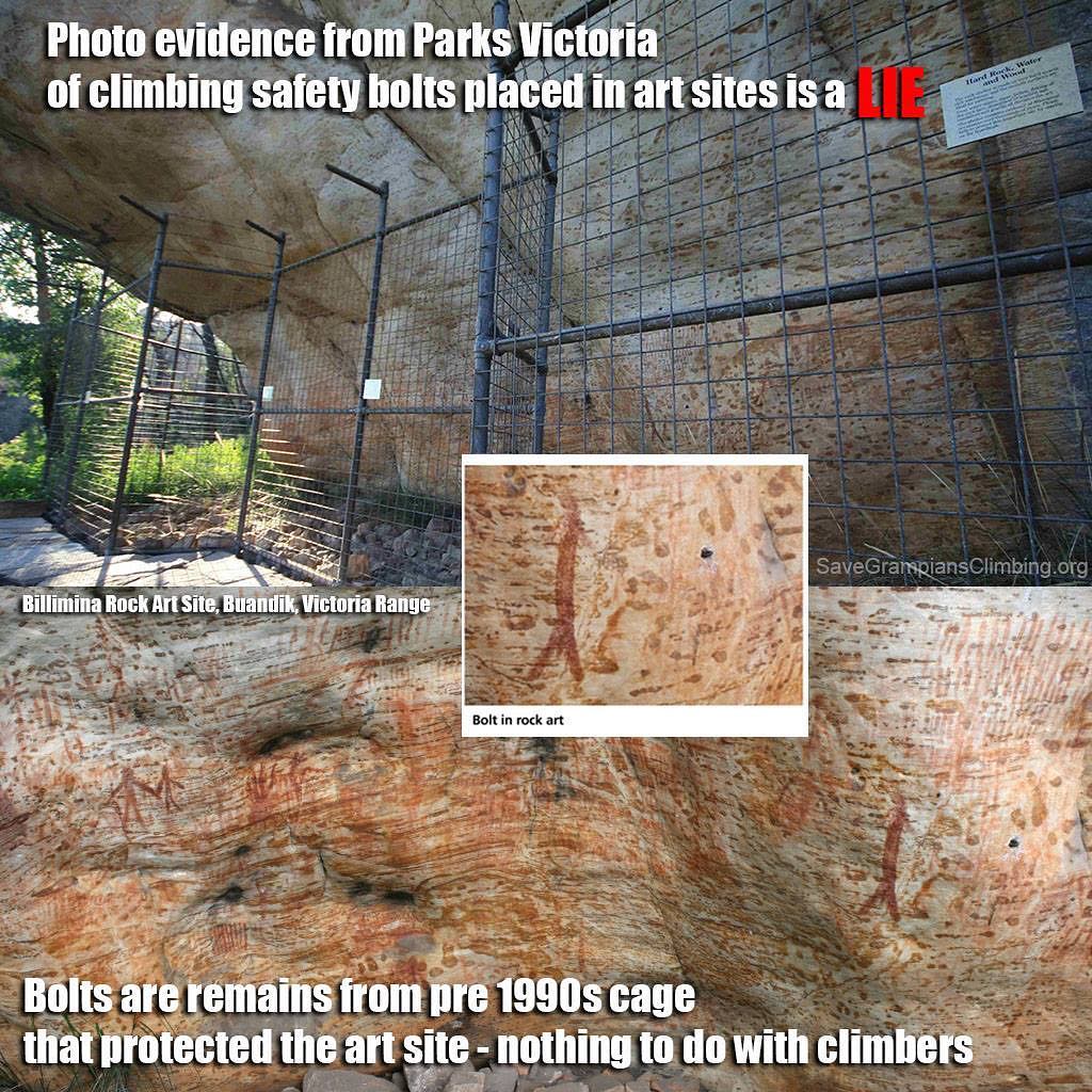 This is the caged art site of Billimina and has never been a climbing area. There is no harm by climbers to anything at this site. It was caged well before climbers started exploring this area in the 1970s. This area is infamous for Parks Victoria publishing a photo saying it was a climbers bolt placed in Aboriginal art – when it was actually an old bolt placed for a previous protective cage. Who can forget this memorable meme we made at the time…