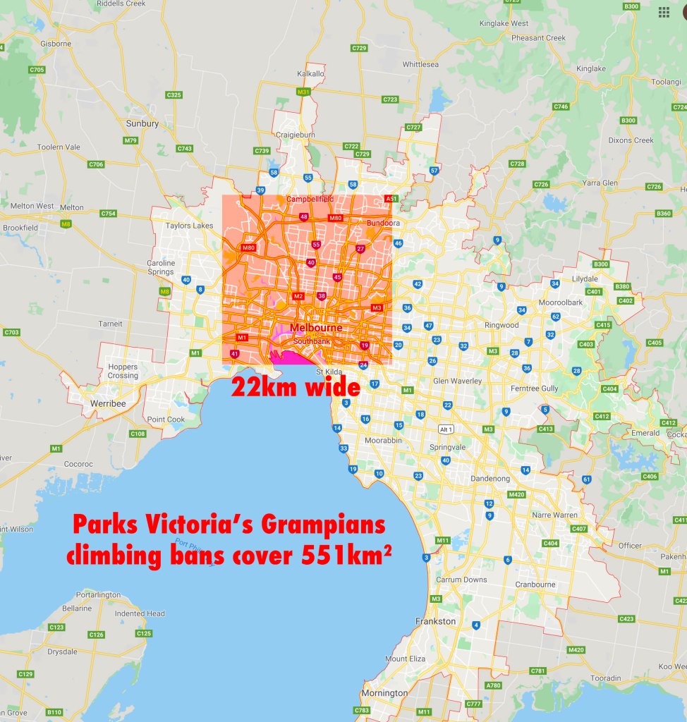 What they fail to make clear (and we have seen the same thing reprinted in the press constantly) is that climbers were upset and up in arms about the widespread SPA bans covering 551km of the Grampians – not just the 8 key sites. Many climbers saw these bans as the death knell of climbing in Victoria and a huge overreach compared to anything experienced before. We have never known if the 8 key site “play” in Parks Victoria’s early press releases was deliberate subterfuge to soften the blow to climbers – or just poor communication. Whatever it was it has worked. To the casual observer these climbing bans appear to only cover 8 small areas. Why the fuss? The reality is what we see below – the world’s largest climbing bans.