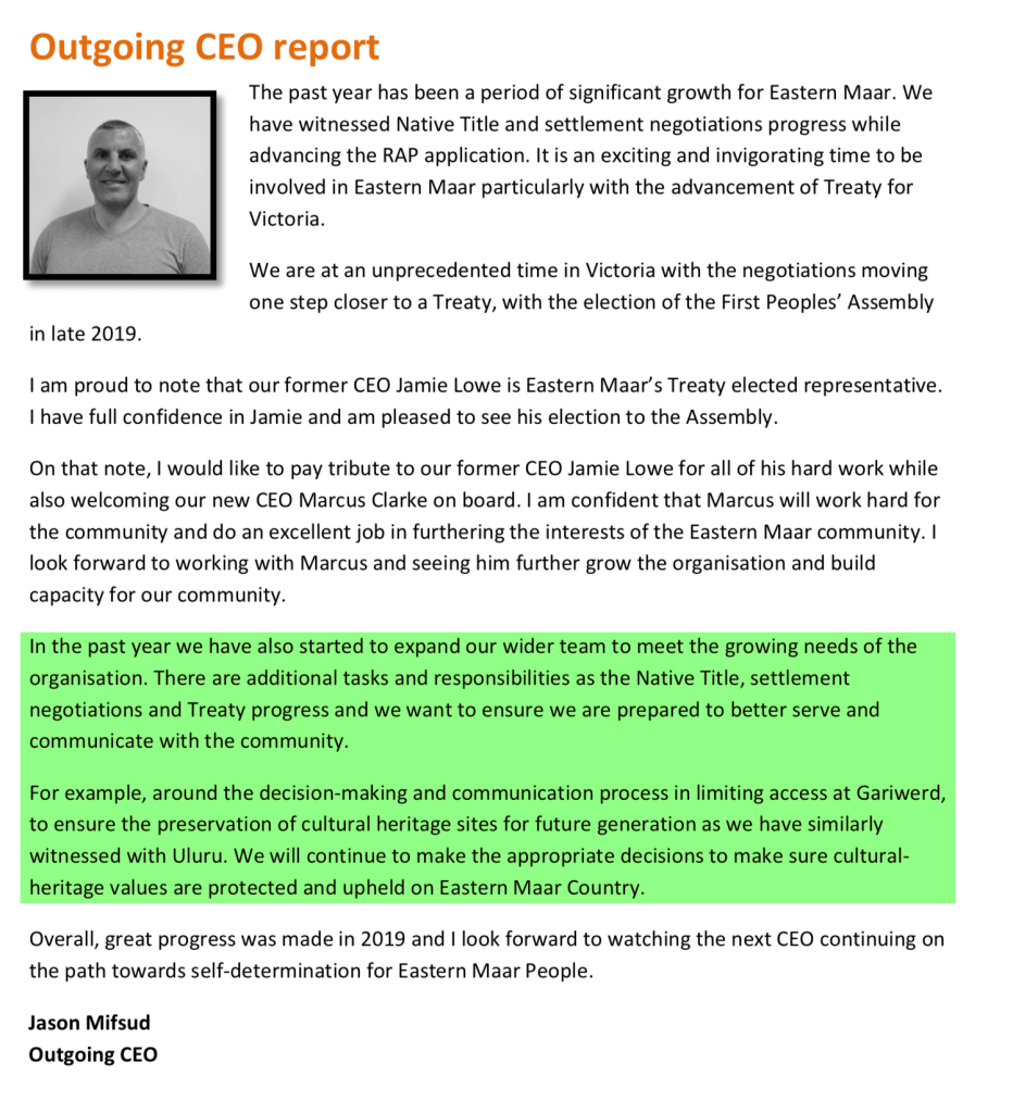 This is the first time we have heard about an investigation into these areas. And again we see the reference to all of them having been harmed despite a lack of evidence to that effect. It seems that there is certainly some friction between Eastern Maar and the government department Aboriginal Victoria. There is some juicy stuff here but we don’t know what it is.