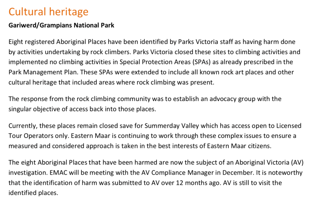 “Eight registered Aboriginal Places have been identified by Parks Victoria staff as having harm done by activities undertaking by rock climbers. Parks Victoria closed these sites to climbing activities and implemented no climbing activities in Special Protection Areas (SPAs) as already prescribed in the Park Management Plan. These SPAs were extended to include all known rock art places and other cultural heritage that included areas where rock climbing was present.”