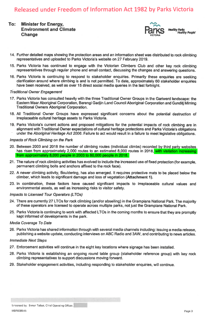 That 20,000 figure is an interesting one. Parks Victoria was pronouncing the figure was 80,000 climbers a year in public statements and briefs sent to the Environment minister early last year. Why the slashing of figures to 1/4 of the original claim? This is the sort of bullshit that made climbers upset and lack trust in the process behind these bans.