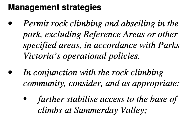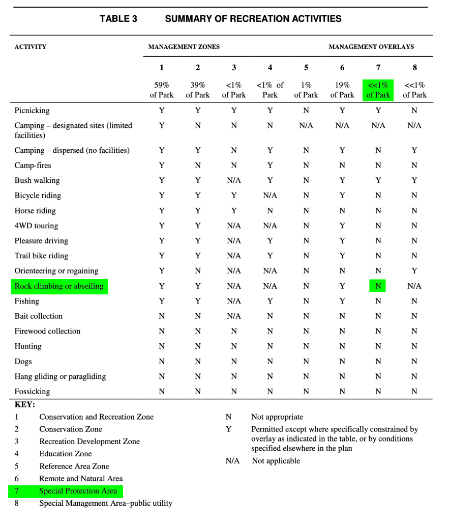 Climbing groups (i.e. the Victorian Climbing Club and CliffCare) didn’t comment on this draft management plan in 2003 as the chart listing the size of SPA zones was incorrect – saying SPA’s covered less than 1% of the park rather than the actual figure of 33%.