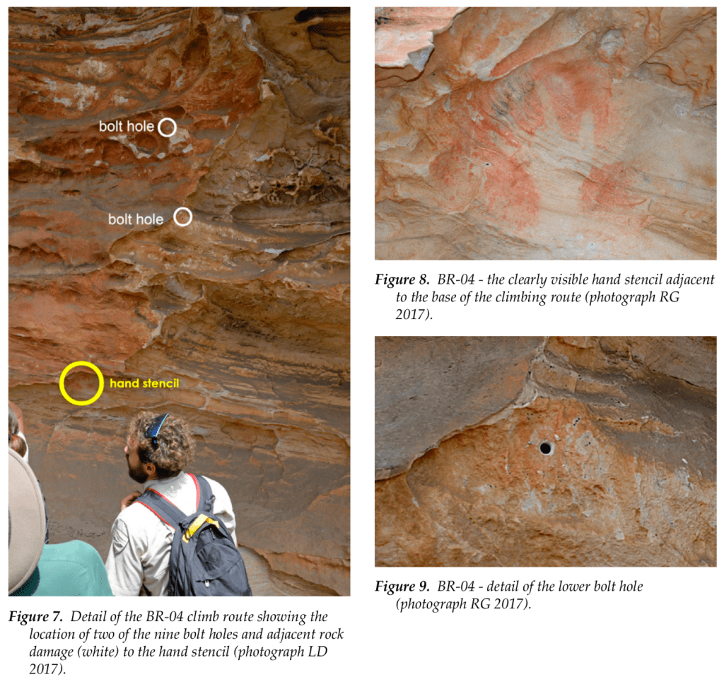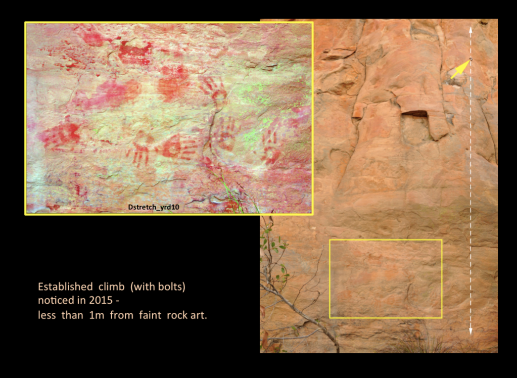 “In 2015 two bolts were noticed on a climbing route up the cliff face of a rock art site (site LL-05; VAHR 7323/195; Figs 4–5). Although the lowest bolt is 3.5 m above the rock art, the climb to get to that bolt is just one metre to the right of the panel of faint handprints, and the use of suitable handholds may have required some climbers to pass over the art. This art panel is particularly significant, being the first rock art site in the State on a barely overhanging cliff face rather than within a rockshelter. The bolts at LL-05 were removed illegally by an anonymous person.