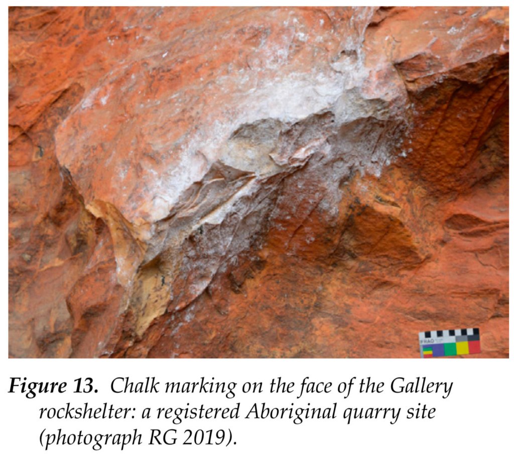 The Gallery is a rockshelter with a high overhanging rock wall as its ceiling, with 15 registered climb routes (The Crag 2019c). The wall was described as ‘Short steep and pocket wall that’s been conveniently machine-gunned with bolts’ (Mentz and Tempest 2001: 202; our emphasis). The rockshelter is also within the Special Protection Zone of the National Park (Parks Victoria 2003) and was registered as an Aboriginal site in August 2000 (VAHR 7323/234), with evidence of Aboriginal quarrying on a number of its protruding quartzitic sandstone cornices