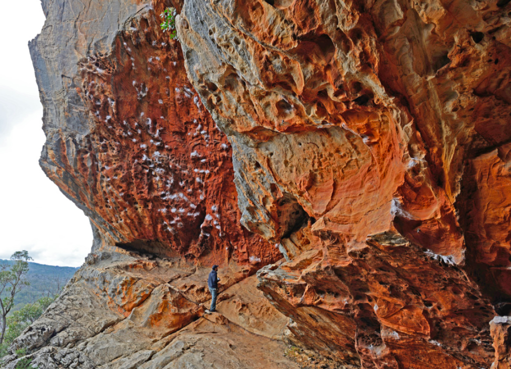 Sounds expensive. Who ya gonna call? The paper actually fails to explain why this is a problem – despite building a case earlier by describing the geology of cave creation. The authors believe an empty bolt hole can release hidden water onto the surface (and the trace minerals in this water) and weaken the surrounding area. Climbers who have installed safety bolts in Victoria sandstone say this is a very rare event only recorded in a couple of places. There appears to be no evidence of this occurring in the bolt holes at this art site.