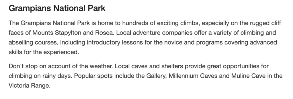 That was far from the only example of contradictory information about SPAs from PV. Summerday Valley and The Gallery both had considerable track work done to them by Parks Victoria to facilitate climbers. At least five print guidebooks were published by the climbing community to these SPA areas and the authors were never contacted by PV about climbing being prohibited in SPAs. Parks Victoria allowed TV commercial shoots, TV shows and licensed tour operators to work in multiple SPA areas right up to last year. These climbing areas were tourist attractions until a year ago – have a read of what Victoria’s official government tourist website said about Grampians climbing in 2018: